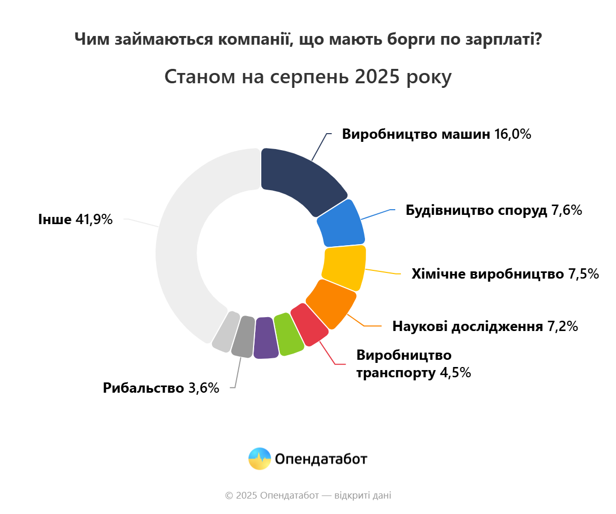 Понад 35 тисяч боргів по заробітній платі працівникам зафіксовано в Україні станом на серпень 2025 року за даними Єдиного реєстру боржників. Майже 2 тисячі компаній не виплатили працівникам зарплатню. Найчастіше боргують державні підприємства та акціонерні товариства. Таку статистику наводить «Опендатабот».