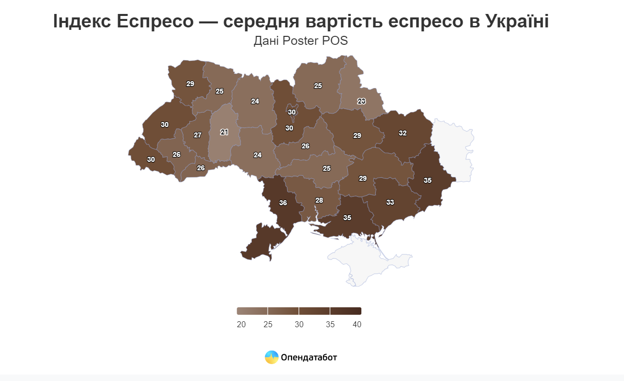 На Хмельниччині еспресо коштує найдешевше серед областей України - 21 гривню. Також дешево, у порівнянні з іншими, воно вартує в Сумській (23 грн) та в сусідніх Житомирській і Вінницькій областях (24 грн).