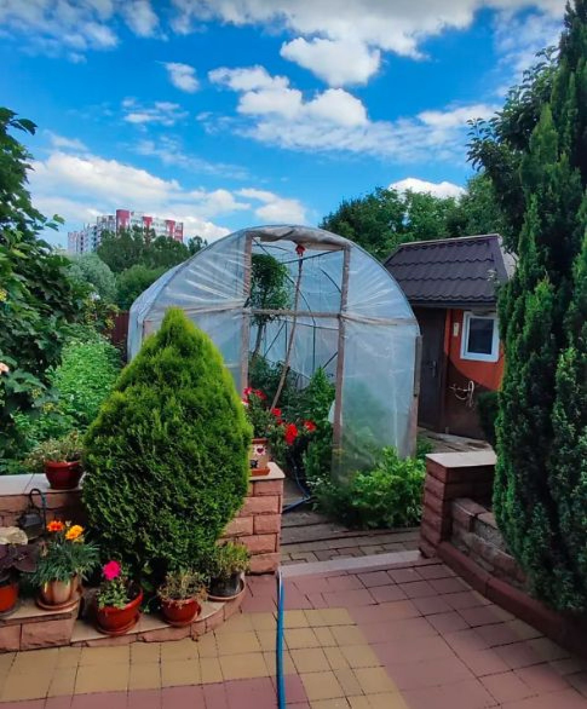 Ділянка цього будинку дворівнева, тобто є верхній і нижній двір, також дві альтанки, гараж, теплиця, фруктовий сад. Подвір’я викладене бруківкою, є багато декоративних насаджень.