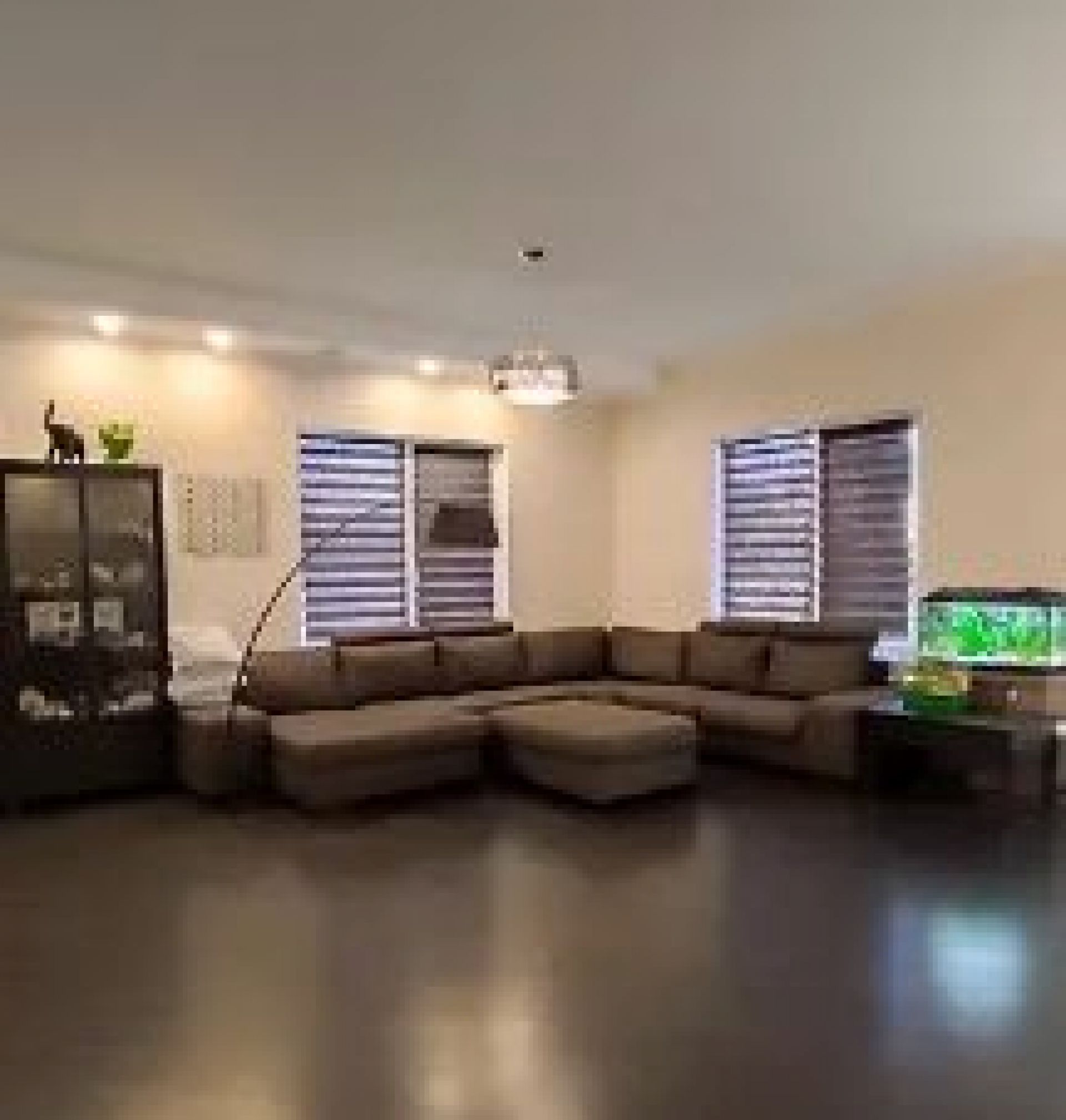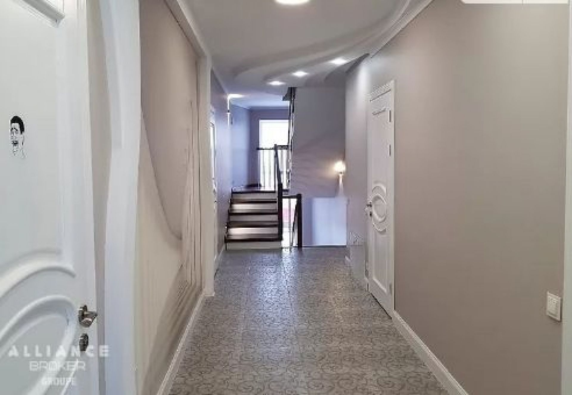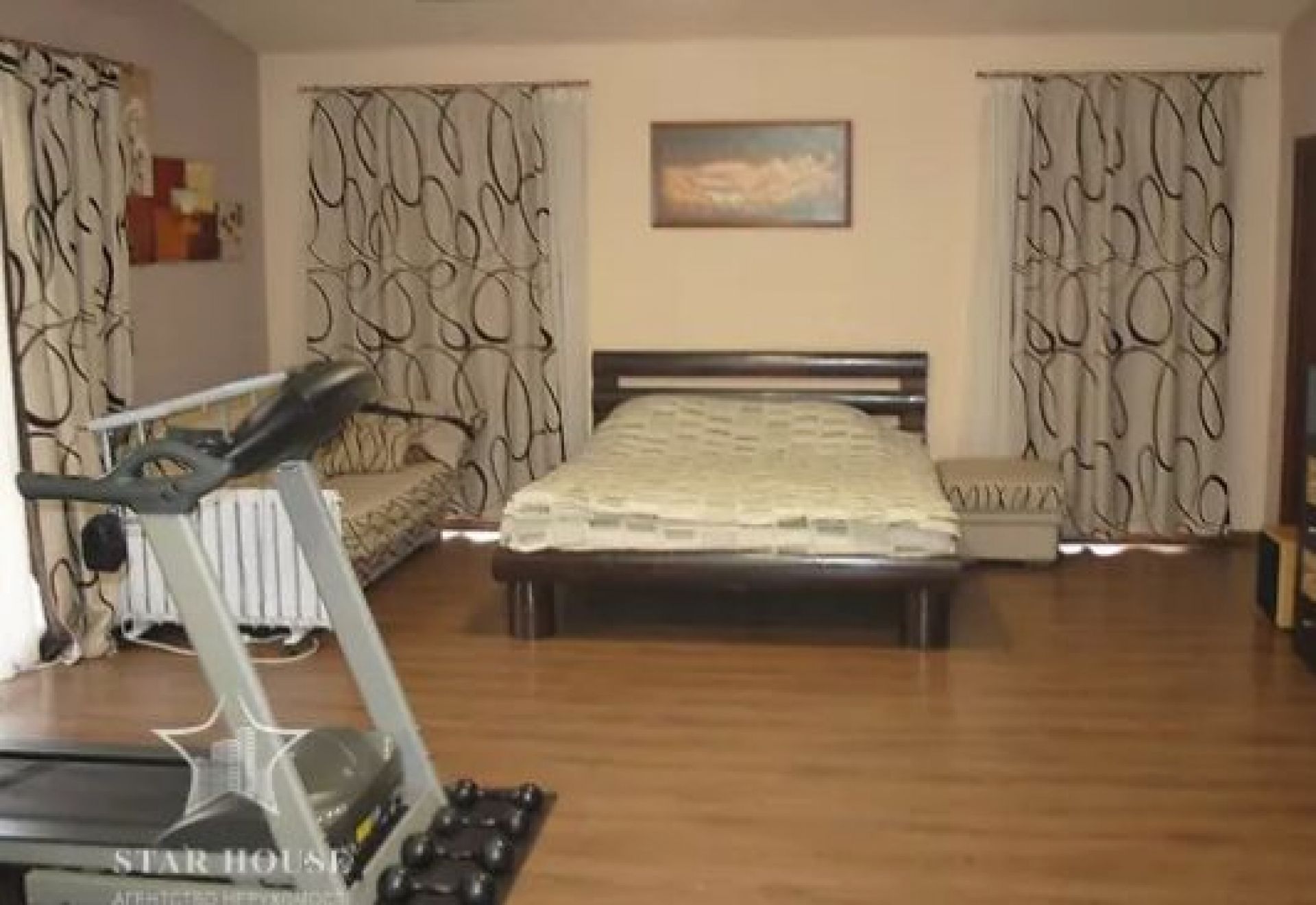У будинку є цокольний поверх, з підсобними приміщеннями та гаражем на дві машини. Також є власна сауна. На двох житлових поверхах є кухня, вітальня і дві спальні. На кожному з поверхів розташований окремий санвузол. В оголошенні написано, що на мансардному поверсі є можливість обладнати тренажерний зал й зону відпочинку.