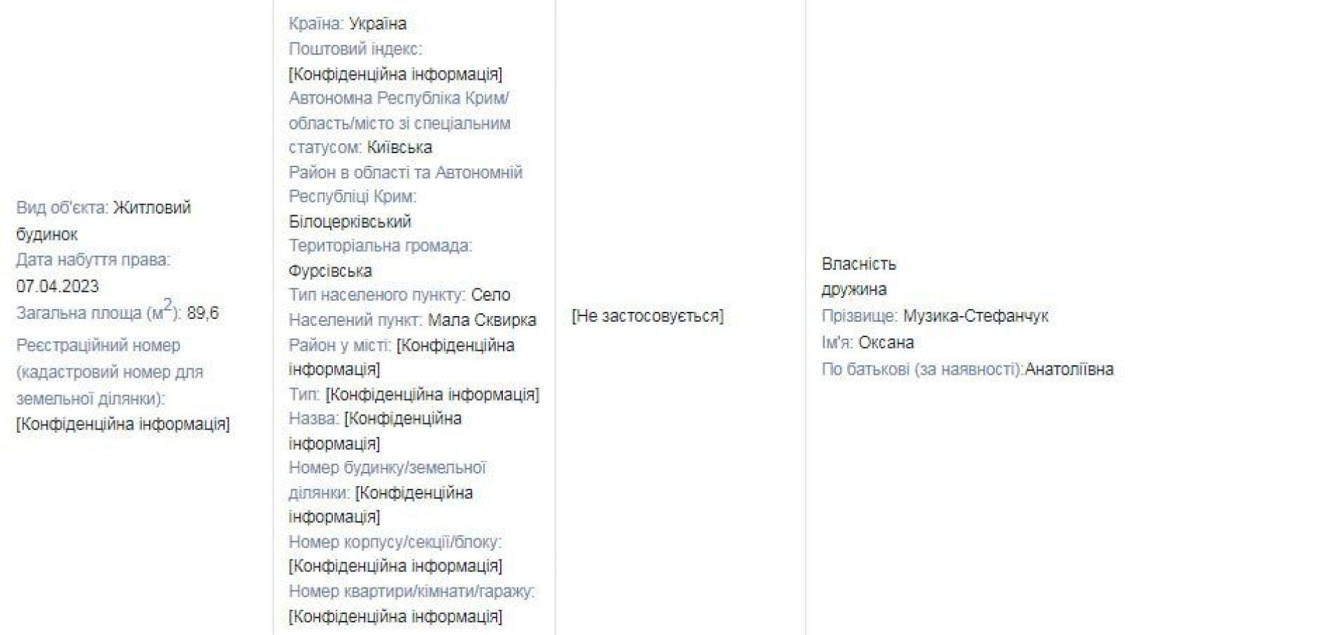 А ще Оксана Музика–Стефанчук тепер є співвласницею двох квартир у Києві. Однією з них, площею 83,8 м², володіє спільно з Анатолієм Музикою, ймовірно батьком – 50 на 50. В декларації не зазначена вартість майна, але якщо заглянути на сайт оголошень, то бачимо: такої ж квадратури помешкання на вторинному ринку може коштувати 95 тисяч доларів. Звісно, все залежить від стану житла та місця розташування.