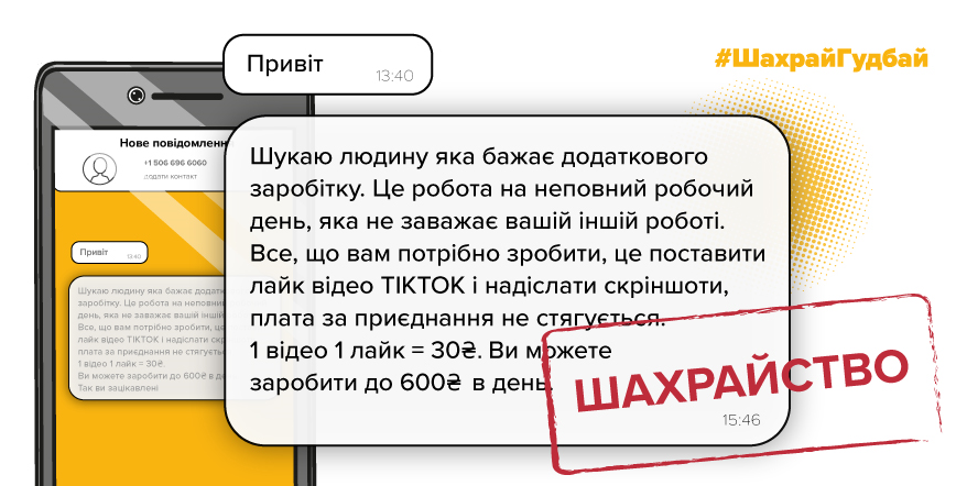 За останні місяці багато українців у Telegram чи WhatsApp отримали пропозиції щодо легких заробітків: необхідно лише ставити лайки до відео в ТікТок чи YouTube, оцінювати ресторани та готелі в Google Maps або вподобати пісні на Spotify. Зацікавився? Лови посилання на відео, музику, готелі чи ресторани, став вподобання, коментуй, надсилай підтверджуючий скріншот і отримуй 100 гривень за три виконані завдання. Загалом пропонують заробіток від 800 до 3000 грн у день. Здавалося б, що це не робота, а мрія.