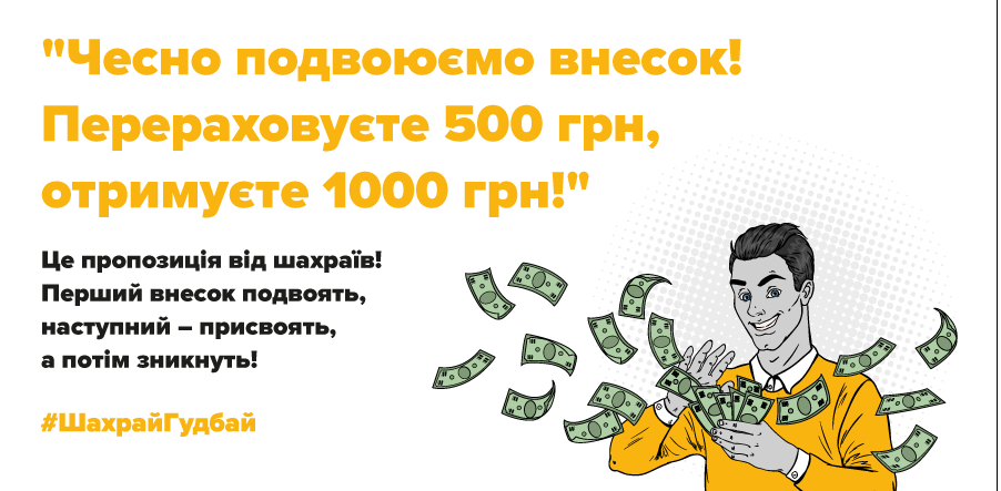 Людина отримує пропозицію переказати певну суму грошей з можливістю отримати вдвічі більше. Наприклад, спочатку вас попросять надіслати 100 гривень, натомість шахраї вам перекажуть 200 гривень, однак наступна сума вашого внеску почне збільшуватися, водночас подвоєних грошей ви так і не отримаєте. Здається, це – проста схема, в яку майже ніхто не повірить, але, на жаль, є люди, які потрапляють до цієї пастки.