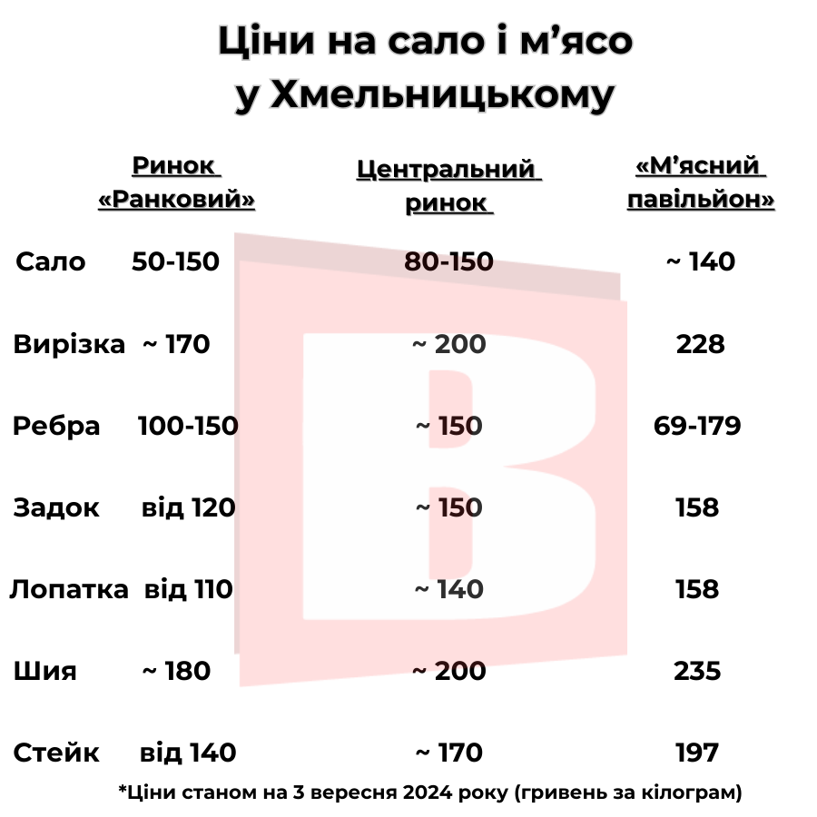 Для порівняння журналістка традиційно відвідала дві точки на продовольчих ринках – «Ранковому» біля Кам’янецького переїзду, а також центрального. Також порівняли ціни в магазині мережі «М’ясний павільйон». Отож, дізнавайтесь, де вигідніше і переглядайте інфографіку.