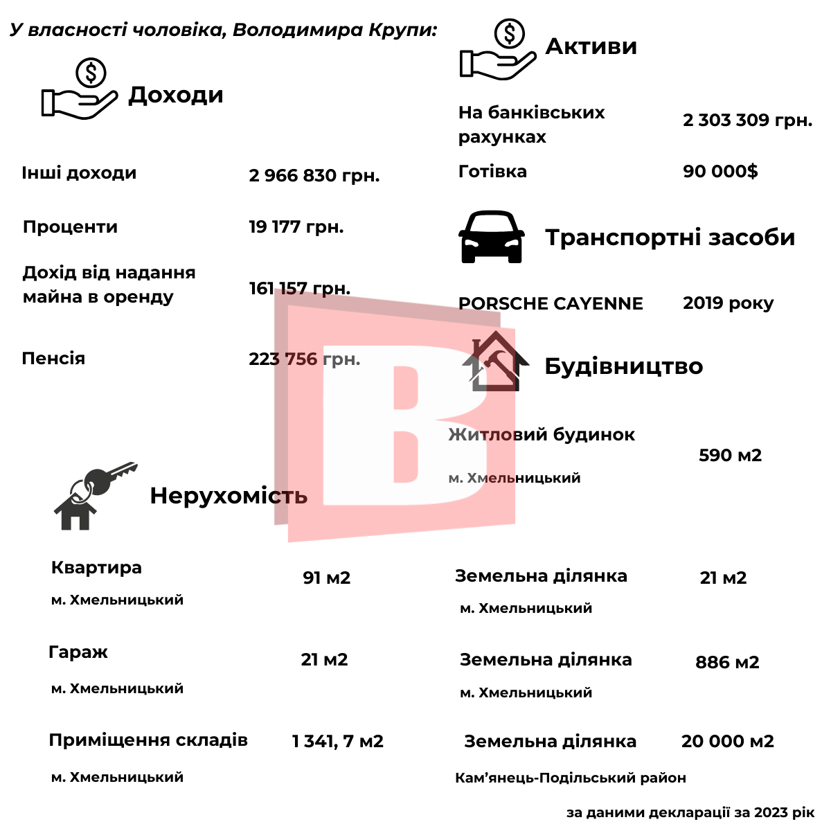 Голова Хмельницького обласного центру медико-соціальної експертизи Тетяна Крупа подала декларацію за 2023 рік. У ній зазначила наявну нерухомість, доходи, активи, транспортні засоби та об’єкти будівництва. З-поміж усього власність як Тетяни Крупи, так і її чоловіка – Володимира Крупи.