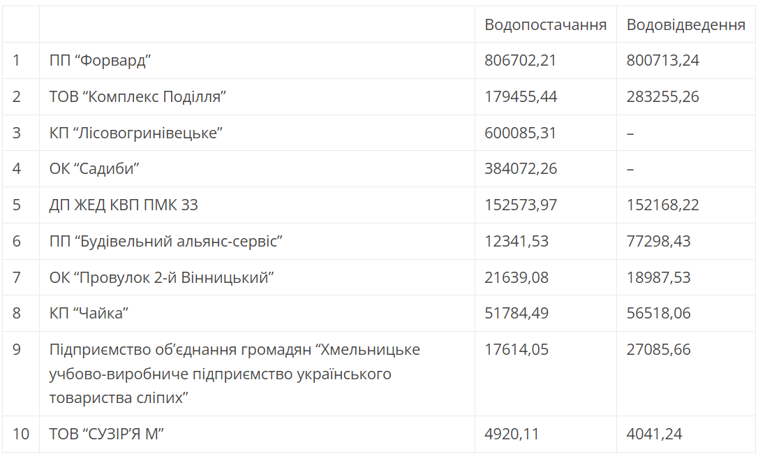 Нещодавно водоканал виставив ТОП-10 адрес багатоповерхівок, які сумарно винні за воду більше 3,6 мільйона гривень. Повний список адрес-боржників можна прочитати в матеріалі “Десятка” будинків в Хмельницькому, які найбільше заборгували за воду в липні (СПИСОК) А сьогодні подали рейтинг боржників серед юросіб.
