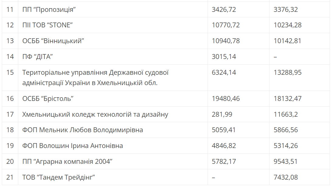 Цього місяця у списку 20 найменувань. Серед них є ФОПи, ОСББ, приватні та комунальні підприємства, судове управління та навчальний заклад.