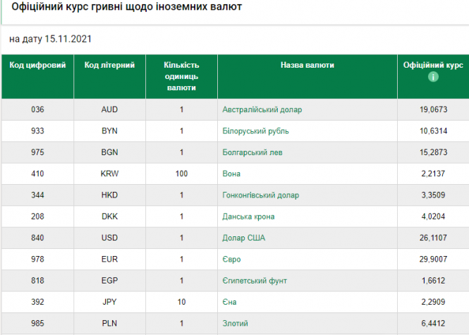 - Національний банк встановив офіційний курс валют на понеділок, 15 листопада.