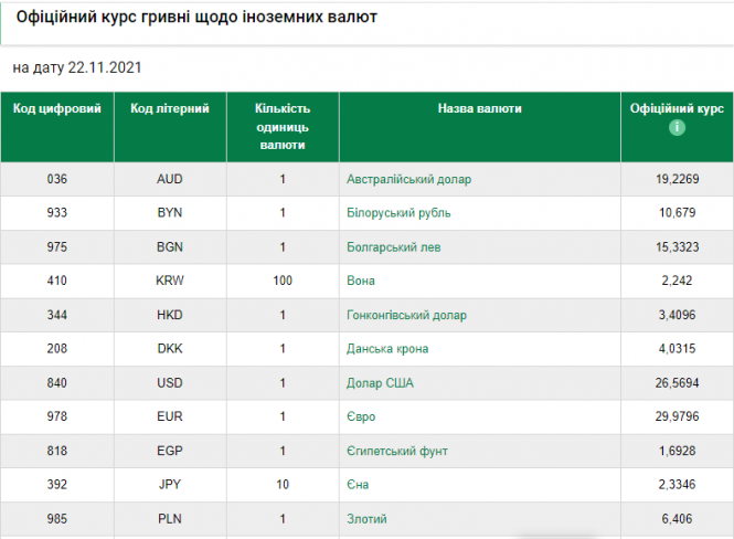 - Національний банк України встановив офіційний курс валют на понеділок, 22 листопада.