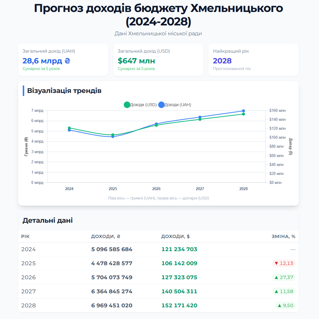 Дані про доходи міського бюджету переглядайте в інфографіці. До неї включені показники 2024 року, поточні показники цього року та прогноз на 2026-2028 роки. При розрахунку бюджету в доларах враховані прогнози валютного курсу з постанови Кабміну.