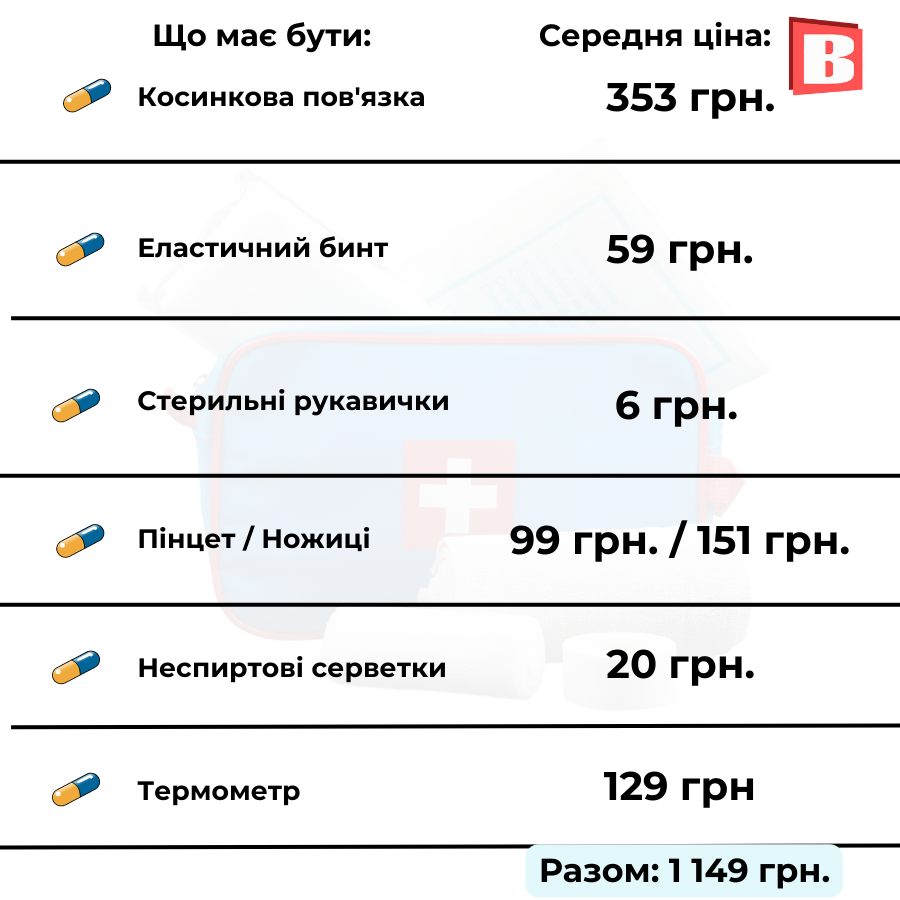 Щоб дізнатися, скільки коштує наповнення базової домашньої аптечки, журналістка vsim.ua оглянула ціни в трьох різних аптеках Хмельницького. В інфографіці вказана середня ціна на кожну позицію. Загальна сума склала 1 149 гривень. До неї не входять безпечні шпильки, які радять в МОЗ. Оскільки даний товар, станом на 13 березня, в аптеках відсутній. Знайомтеся зі списком наповнення домашньої аптечки та цінами далі.