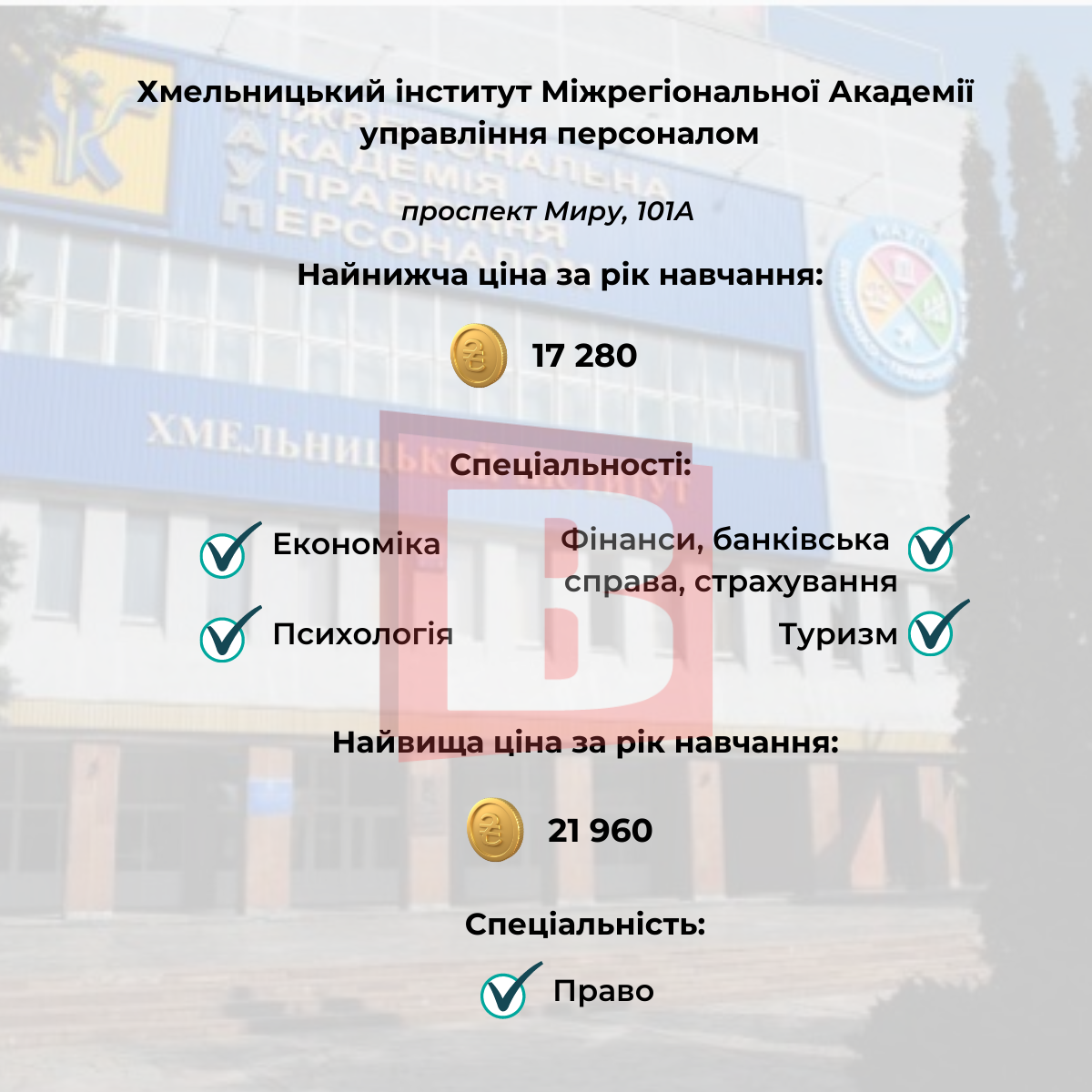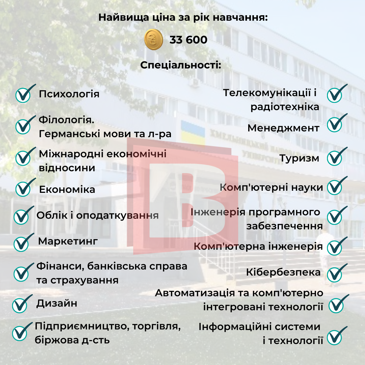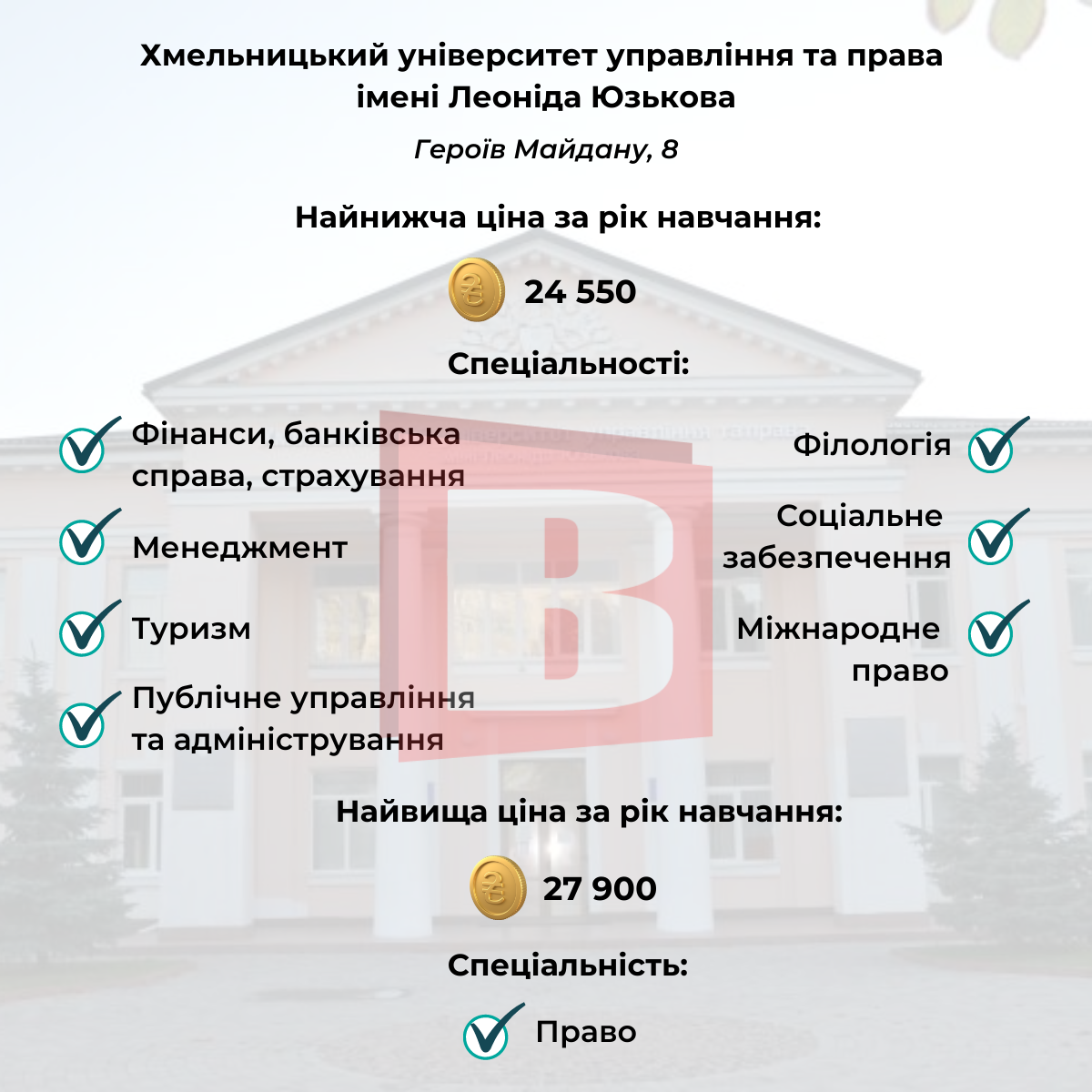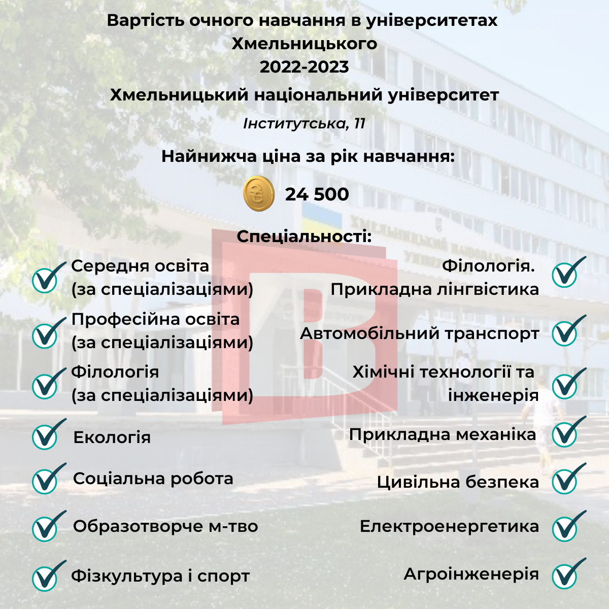 До переліку “вишів” увійшли Хмельницький національний університет, гуманітарно-педагогічна академія, університет управління та права імені Леоніда Юзькова, університет економіки і підприємництва, Національна академія прикордонної служби України імені Богдана Хмельницького та МАУП. Також оглянула вартість навчання на контракті у Херсонському національному технічному університеті. Оскільки через війну “виш” евакуювався у Хмельницький. Наразі він розмістився в одному з корпусів ХНУ на Інститутській.