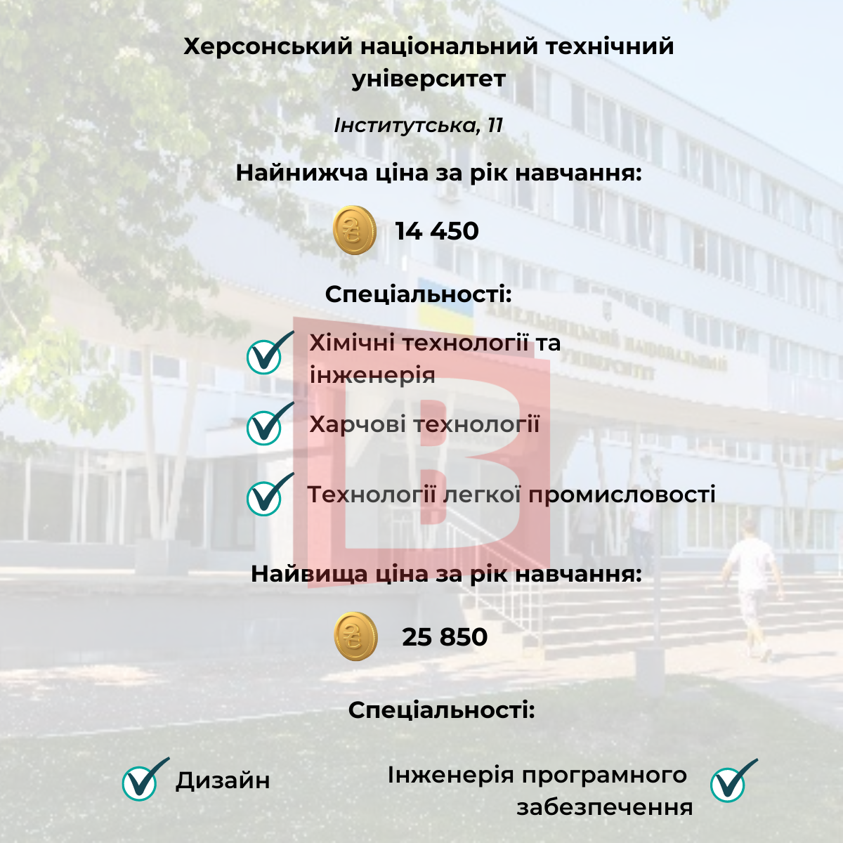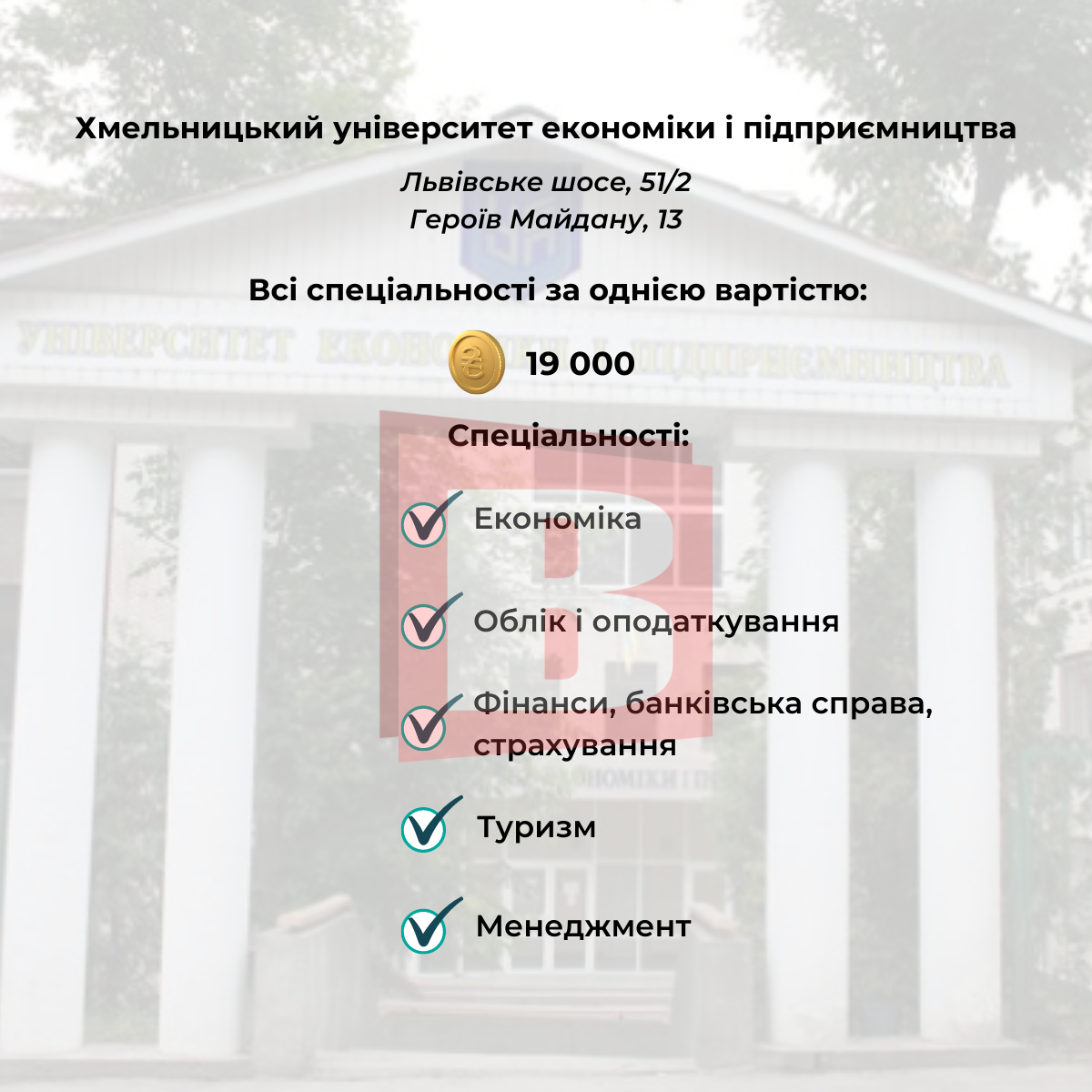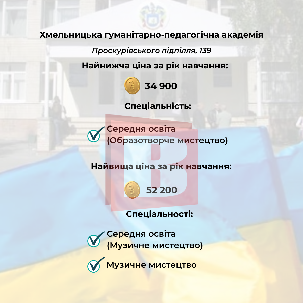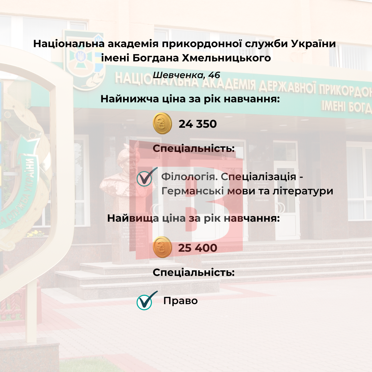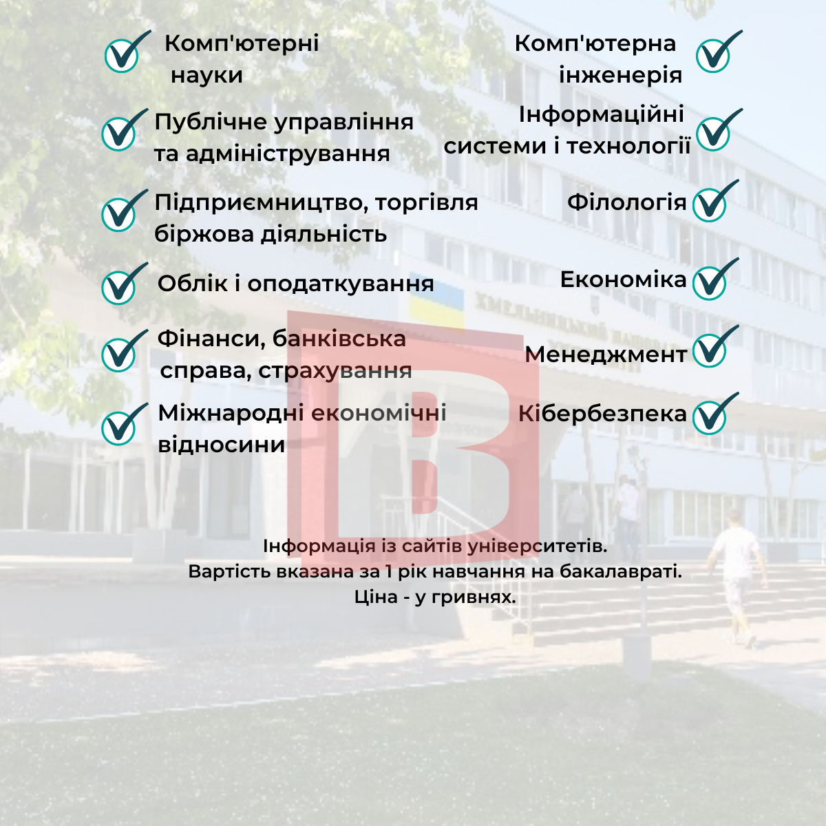 До переліку “вишів” увійшли Хмельницький національний університет, гуманітарно-педагогічна академія, університет управління та права імені Леоніда Юзькова, університет економіки і підприємництва, Національна академія прикордонної служби України імені Богдана Хмельницького та МАУП. Також оглянула вартість навчання на контракті у Херсонському національному технічному університеті. Оскільки через війну “виш” евакуювався у Хмельницький. Наразі він розмістився в одному з корпусів ХНУ на Інститутській.