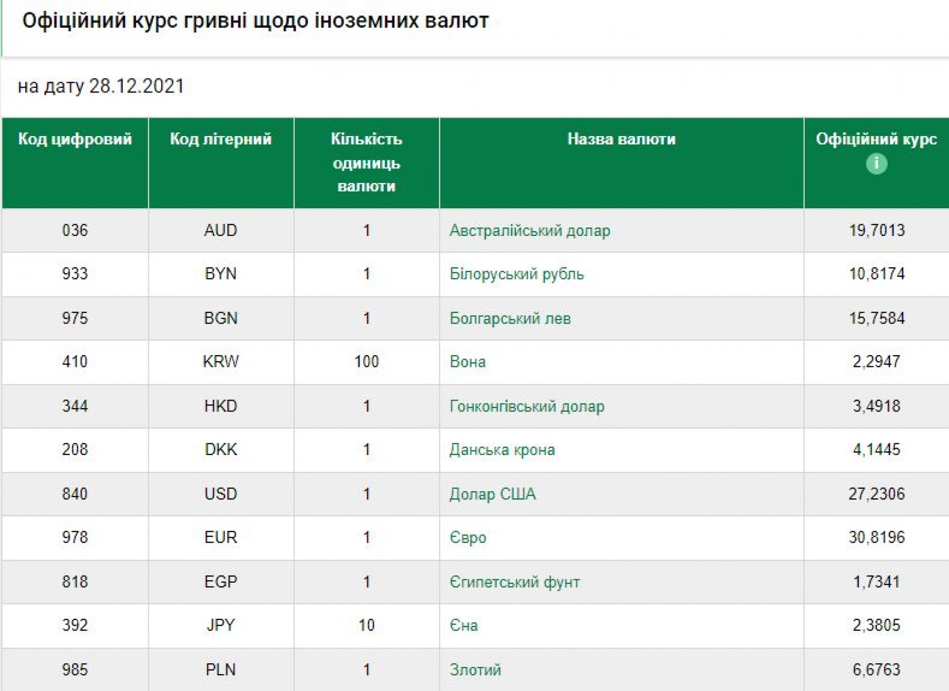 - Національний банк України встановив офіційний курс валют на 28 грудня.