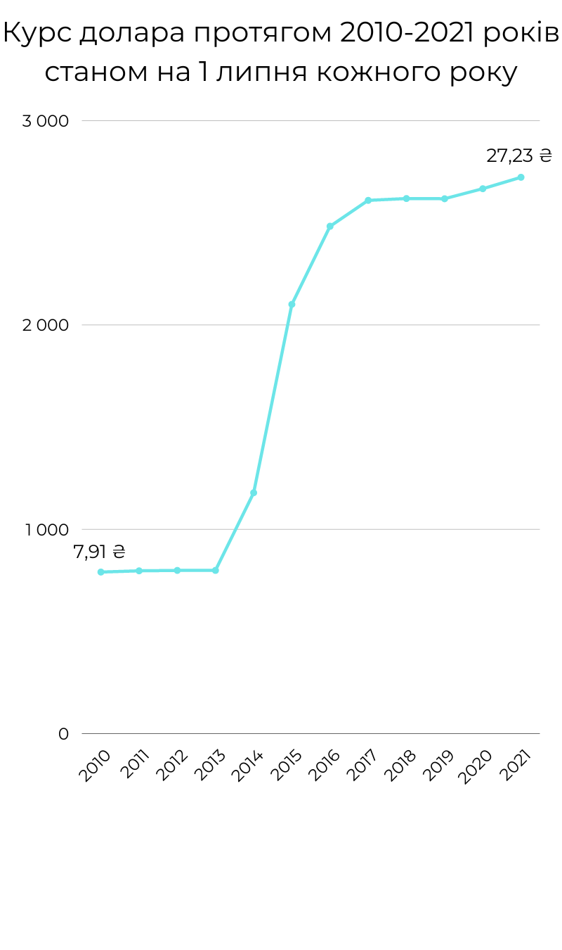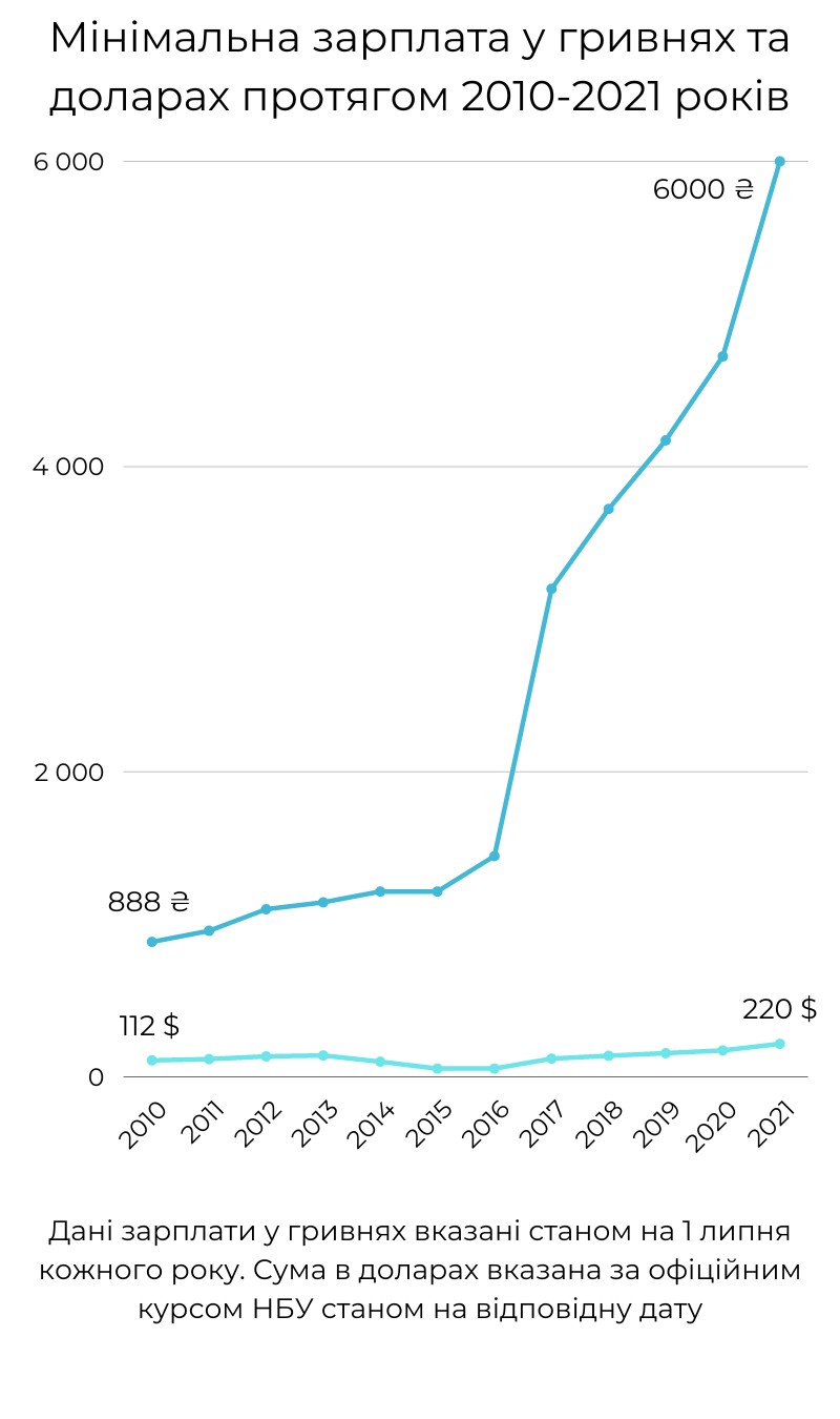 Мінімальна зарплата зросла від 888 гривень у 2010 році до 6 000 гривень у 2021 році. Таким чином відбулося майже семикратне зростання. Порівняємо те ж у доларах. За цей же період мінімальна зарплата зросла від 112 до 220 доларів. Це зростання у майже два рази.