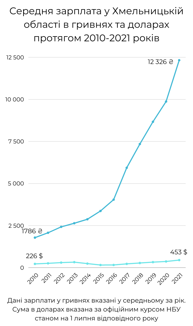 Середня зарплата по Хмельницькій області в 2010 році складала 1 786 гривень, а у 2021 році 12 326 гривень. Це також майже семикратне зростання. У доларах зміна не така масштабна — від 226 у 2010 році до 453 у 2021-му. Це зростання приблизно удвічі.