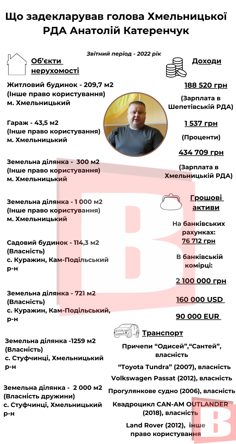Цього разу проаналізуємо, чим багатий голова Хмельницької районної державної адміністрації Анатолій Катеренчук.