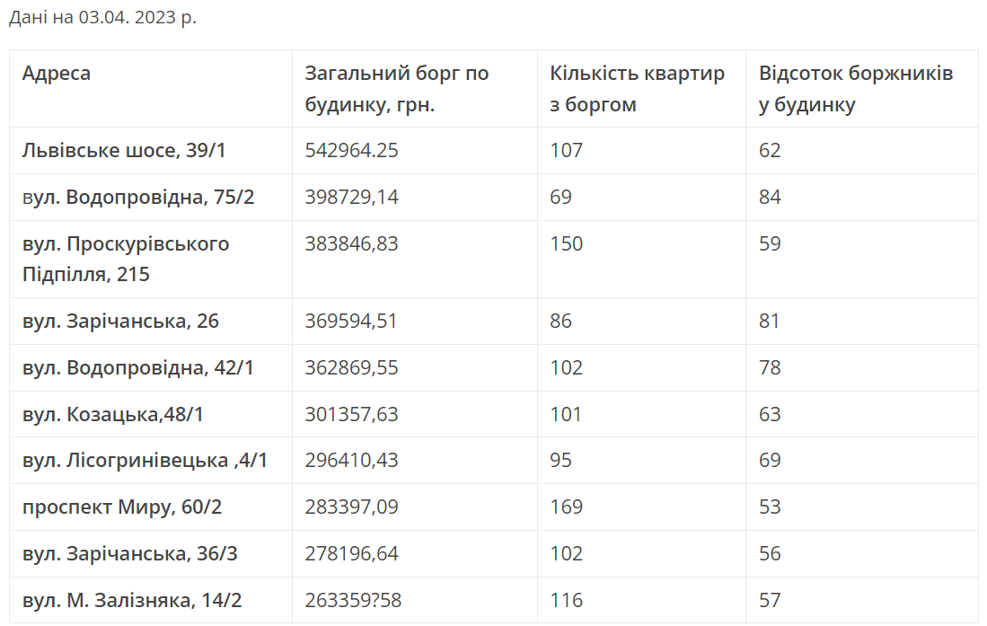 У список потрапили адреси з різних мікрорайонів міста. Загальний борг лише з 10 цих будинків становить більше 3 мільйонів 480 тисяч гривень.