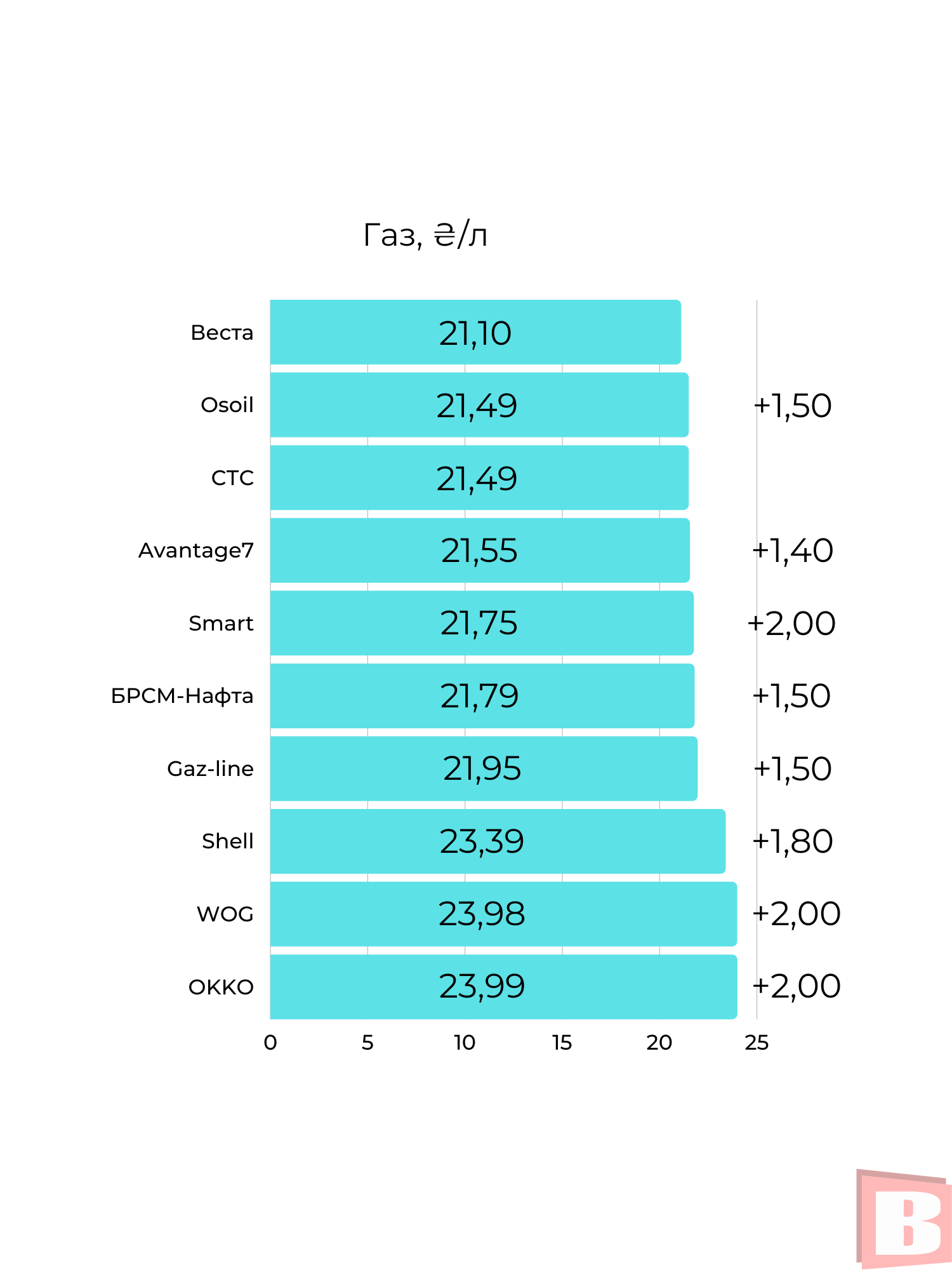 Вартість газу зросла на 1,4-2 гривні. Заправок, які лишили вартість незмінною з 30 червня, немає. Зараз літр газу коштує від 21 гривні, хоча 30 червня можна було знайти за менш як 20 гривень. Поточні ціни на кожній АЗС та різницю з минулою п’ятницею переглядайте в інфографіці.