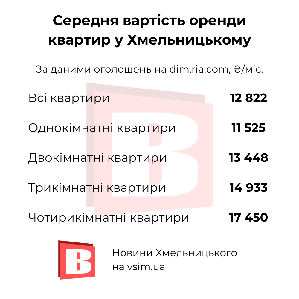 На сайтах оголошень можна знайти сотні пропозицій про оренду квартир у Хмельницькому. Можна обрати за ціною, розташуванням, станом, кількістю кімнат чи іншими важливими для вас параметрами. У середньому вартість оренди квартири на місяць у Хмельницькому складає 12 822 гривні. Такими є результати аналізу понад 200 оголошень на сайті dim.ria.com, проведеного журналістом vsim.ua. Для порівняння, у березні минулого року, тобто 17 місяців тому, середня вартість складала 10 754 гривні.