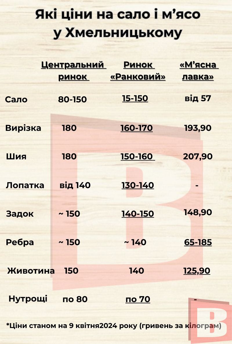 Для порівняння журналістка відвідала найпопулярніші точки, куди хмельничани вирушають за м’ясом – це павільйони на центральному ринку і «Ранковому» по Кам’янецькій. А також дізнались ціни в магазині мережі «М’ясна лавка».