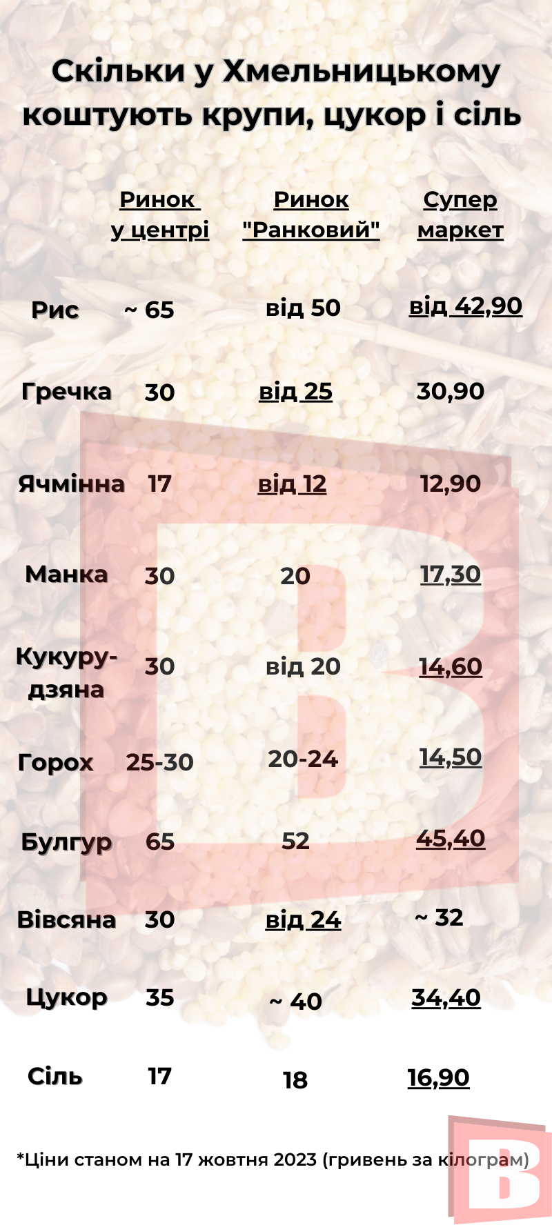 Цього вівторка ми розповімо про вартість цукру і круп на прилавках Хмельницького. Для цього ми обрали перелік найпопулярніших, як рис, гречку, манку, кукурудзяну й ячмінну крупи, вівсяні пластівці та булгур. Також розповімо, як змінилась ціна на цукор.