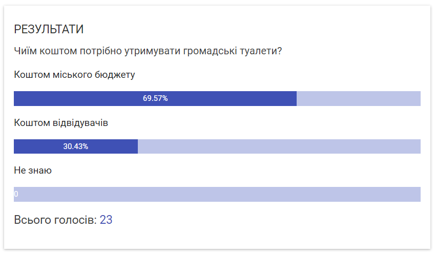 Нагадаємо, що минулого тижня на нашому сайті вийшов матеріал під назвою «Де в Хмельницькому є громадські туалети та хто за них платить». У ньому ми запитали читачів, хто має платити за утримання громадських туалетів у місті. На думку більшості, фінансуватися це має з міського бюджету.