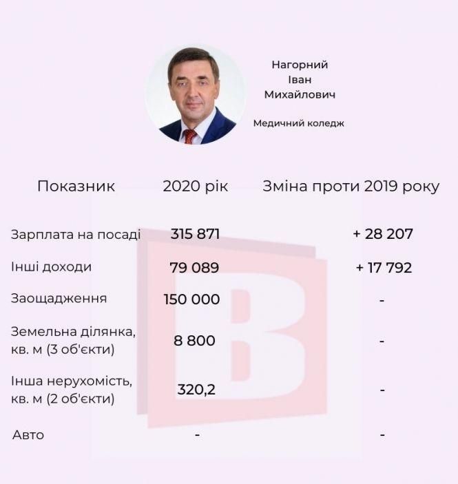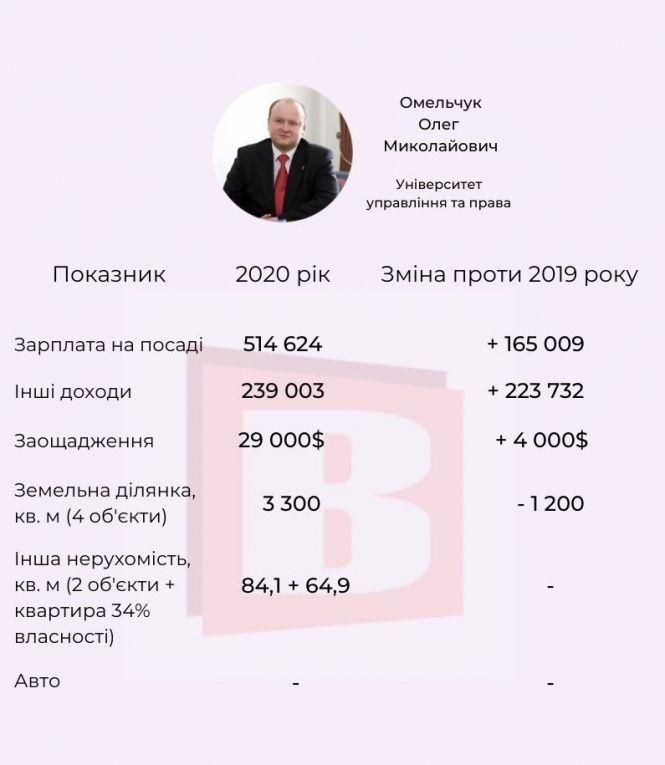 Ніхто з керівників “вишів” у 2020 році не придбав нерухомість. Збільшилися лише їхні заробітні плати. Найбільше в ректора університету управління та права Олега Омельчука. У 2020 році він отримав 514 624 гривні, що на 165 009 більше, ніж попереднього року.