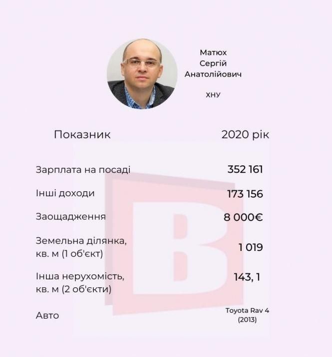 Доходи та нерухомість майже усіх керівників ми порівняли із задекларованим у 2019 році. Сергія Матюха обрали ректором Хмельницького національного університету лише минулого місяця. Тож його статки й зарплатню із попереднім роком ми не порівнювали. Раніше Сергій Матюх був проректором.
