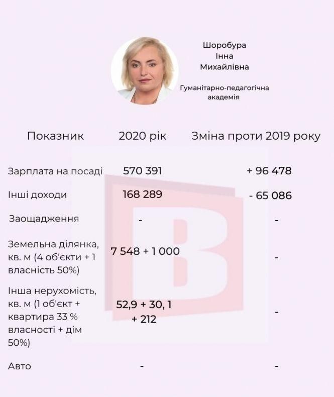 До слова, найбільше за минулий рік за основним місцем роботи заробила ректор гуманітарно-педагогічної академії Інна Шоробура - 570 391 гривню. Це на 96 478 більше, ніж у 2019 році. Серед інших доходів - 168 289 гривень, що в порівнянні з попереднім роком подання декларації менше.