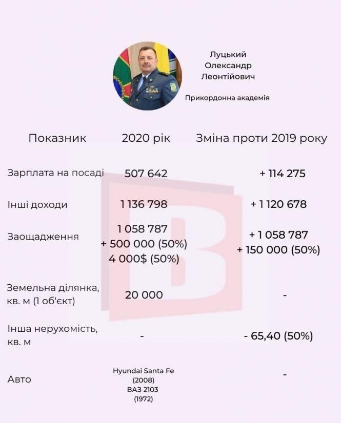 Ректор прикордонної академії Олександр Луцький у 2020 мав зарплатню 507 642 гривні. Наприклад, у 2019 його дохід за основним місцем роботи був меншим на 114 275. Інші його доходи складають більше мільйона, а саме - 1 136 798 гривень.