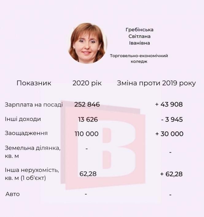 Найменшу зарплату в 2020 році отримала керівник торговельно-економічного коледжу Світлана Гребінська - 252 846 гривень. Це на 43 908 більше, ніж у 2019.