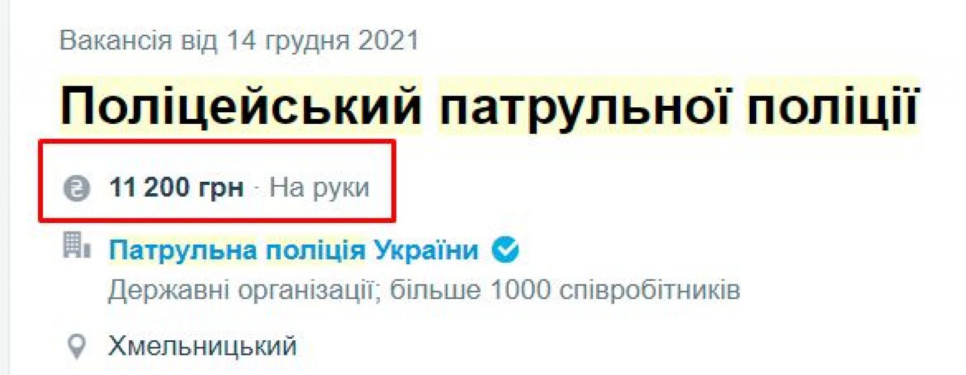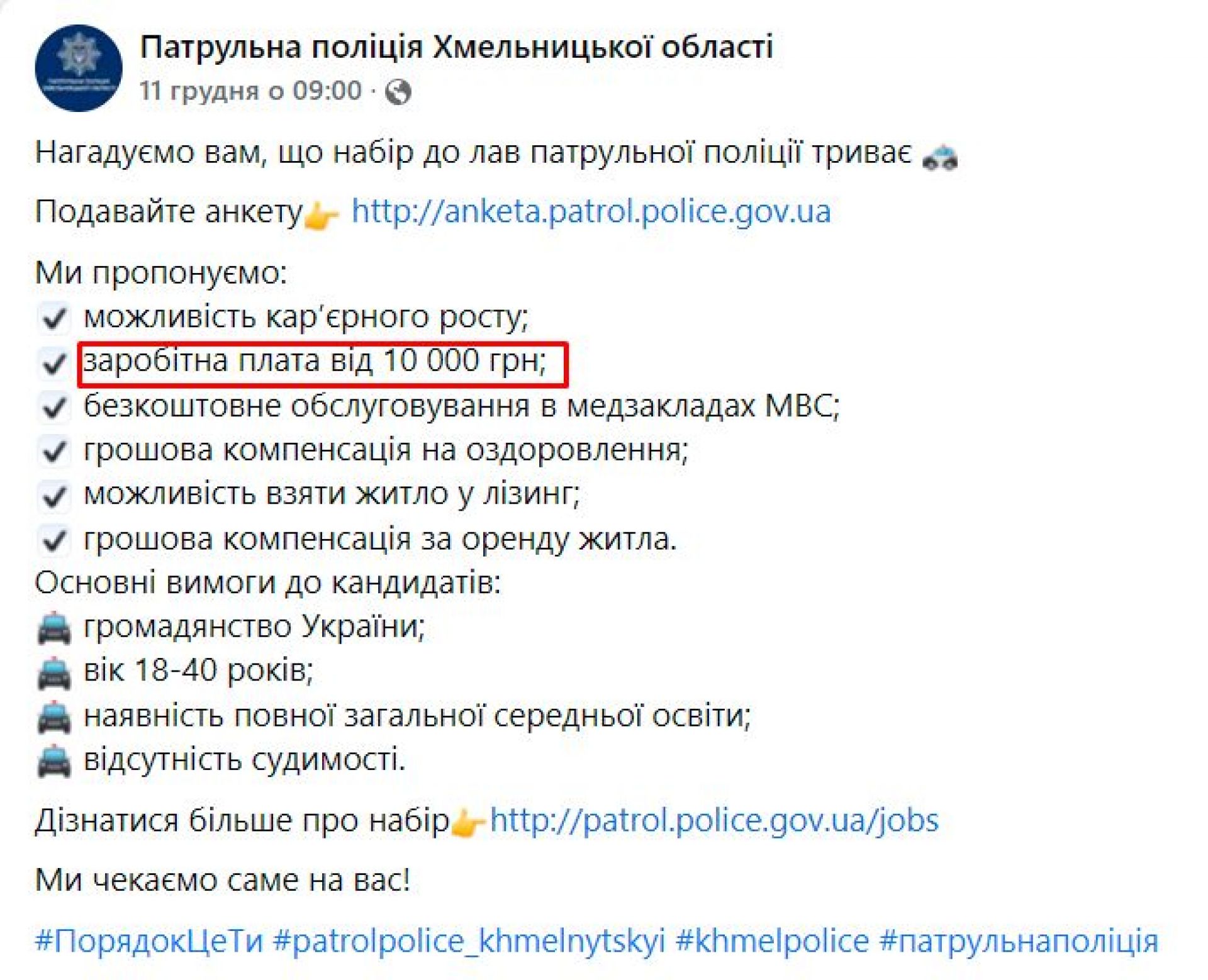 А от на сторінці Патрульної поліції Хмельницької області 11 грудня було розмішене оголошення про набір, в якому була вказана інша мінімальна зарплата - від 10 тисяч гривень.