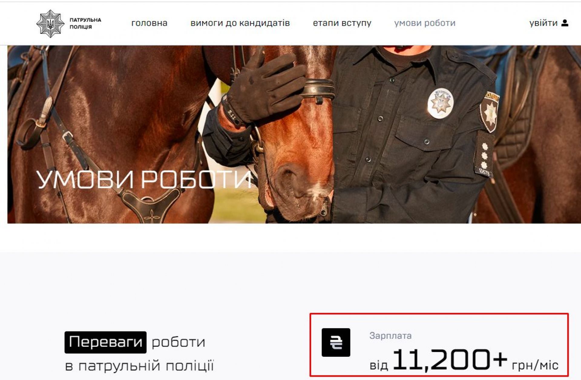 Така ж зарплата, але із уточненням “від 11 200”, вказана на офіційному сайті патрульної поліції України.