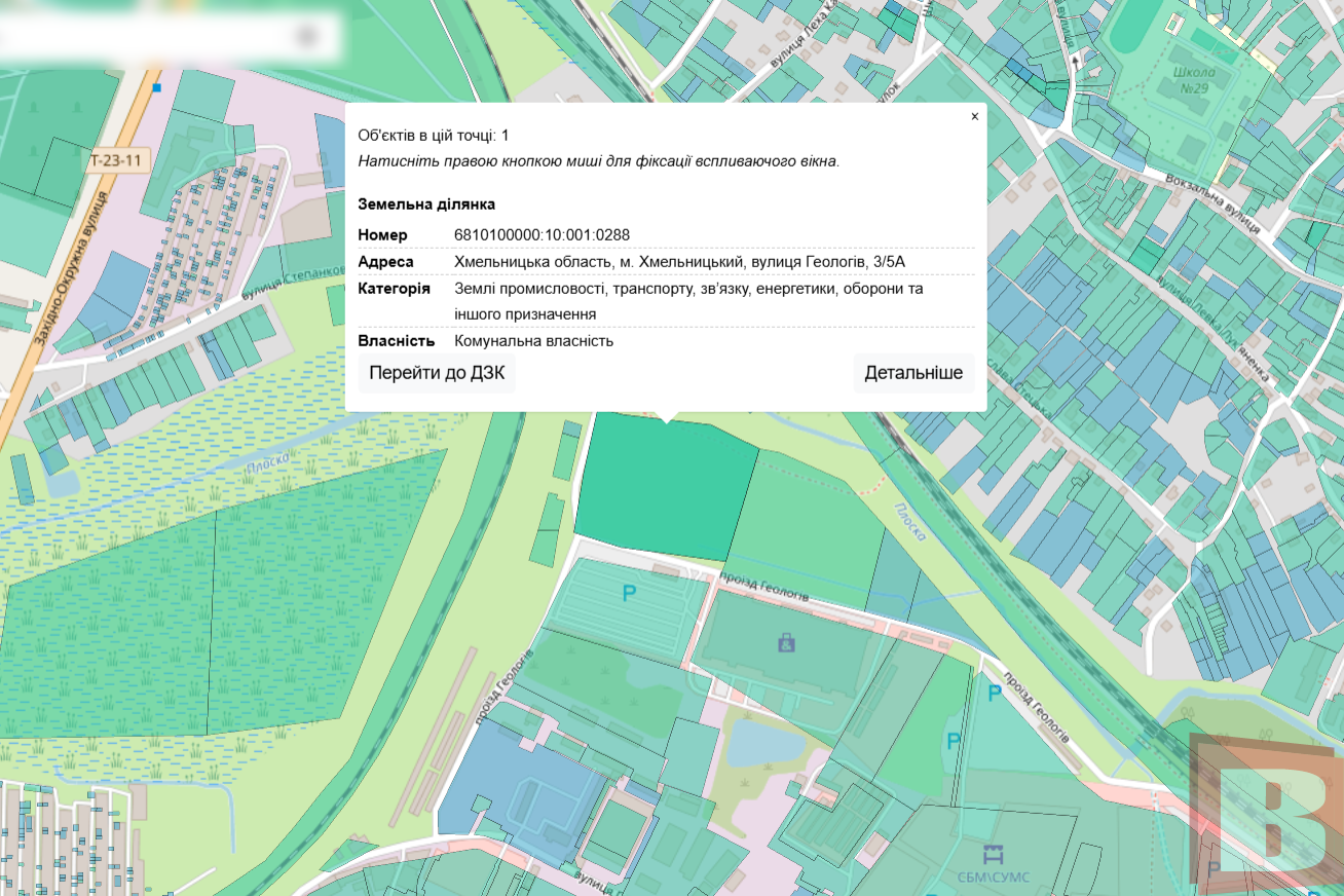 Земельна ділянка має кадастровий номер 6810100000:10:001:0288 та розташована на Геологів, 3/5-А. Це місце між залізничними коліями, річкою Плоска та парковкою колишнього ТЦ «Європа». Площа земельної ділянки — 2,7 гектара, цільове призначення — для розміщення та експлуатації основних, підсобних і допоміжних будівель та споруд підприємств переробної, машинобудівної та іншої промисловості.