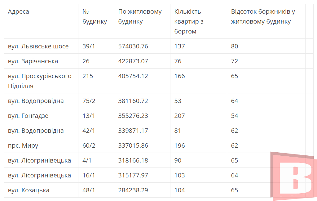 У переліку є 10 адрес. Сума заборгованості за водопостачання і водовідведення за кожним із них коливається від 574 до 284 тисяч гривень. Лідером рейтингу є будинок на Львівському шосе, 39/1. Там борги мають 80% споживачів, а це 137 квартир. Повний рейтинг переглядайте нижче.
