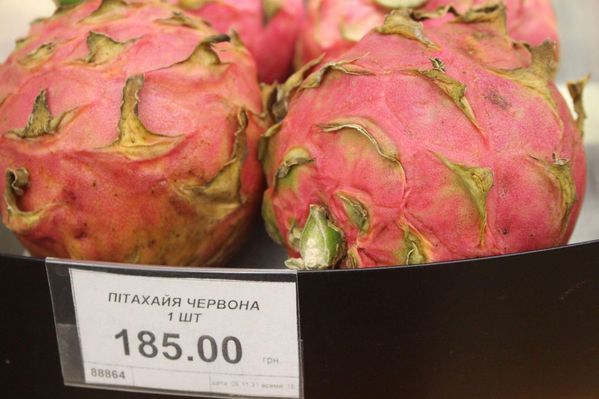 Деякі фрукти продають поштучно. Одна пітахайя коштує 185 гривень, манго - 48 гривень, салак з Таїланду - 39 гривень, рамбутан та маракуйя - майже по 16 гривень.