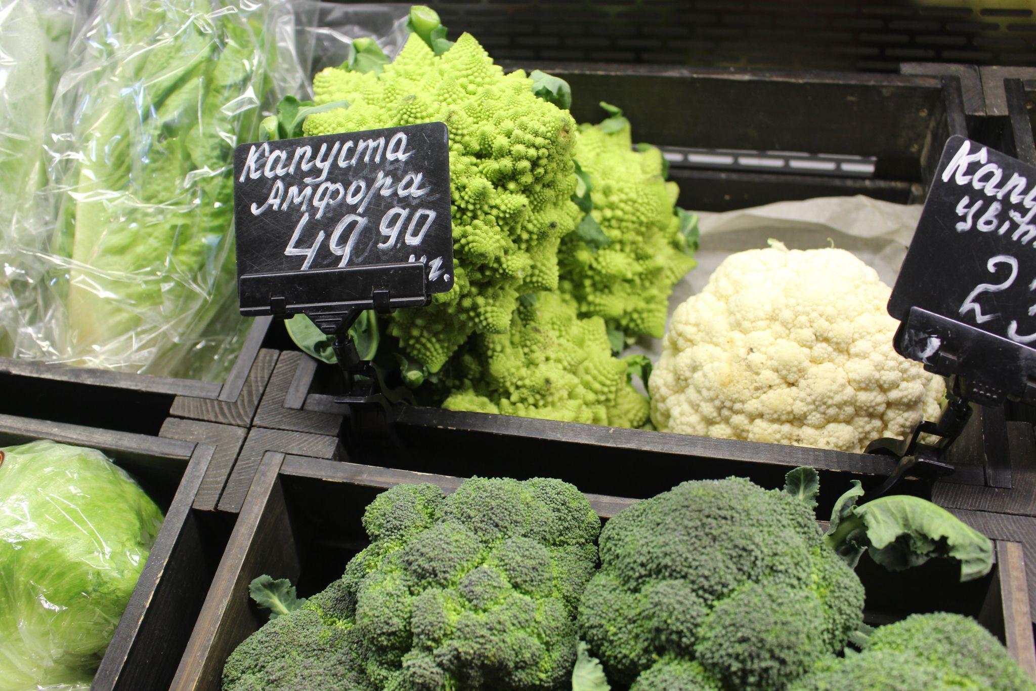 Поруч лежить броколі, кілограм якої коштує 57 гривень, а на сусідньому прилавку продають брюссельську капусту. Вартість - 73 гривні за кілограм.