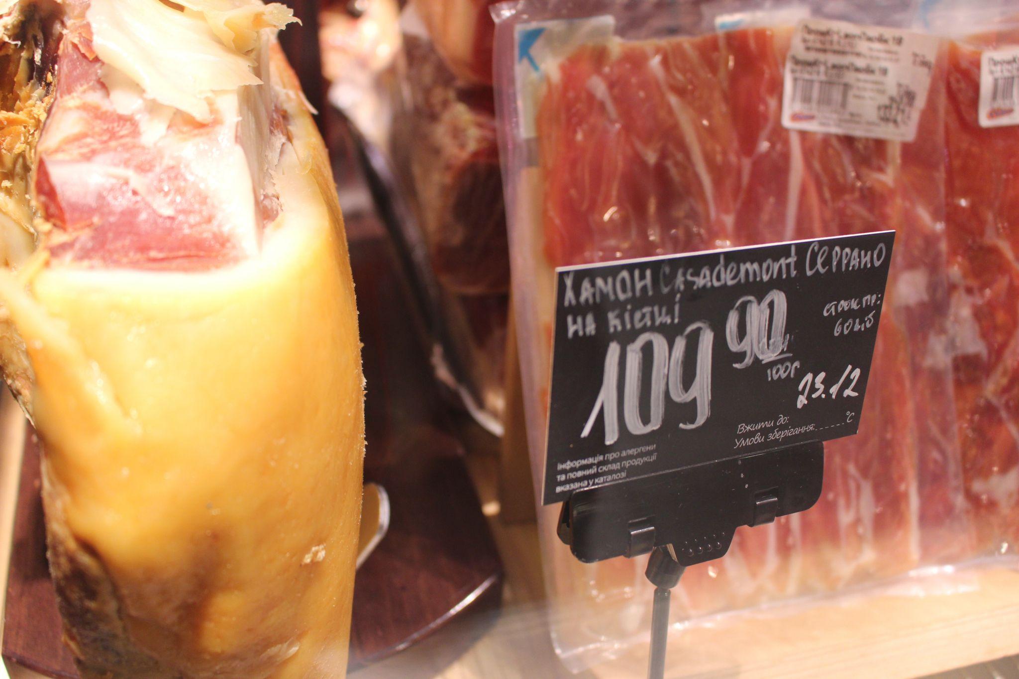 Серед м'ясних делікатесів на прилавках супермаркетів є відомий усім хамон. Це cиров’ялене свиняче стегно, національний іспанський делікатес. У супермаркетах його можна придбати за різними цінами. Найдешевший, серед тих, які вдалося зустріти, коштує за 444 гривні за кілограм. У середньому його ціна коливається в межах 800-1100 гривень за кілограм. Однак є й за 1790 гривень.
