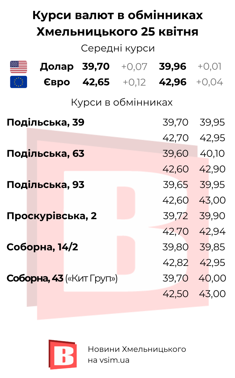 Середні курси валют в обмінниках Хмельницького станом на сьогодні, 25 квітня, переглядайте нижче. Сірим кольором вказана різниця проти минулого четверга, 18 квітня.