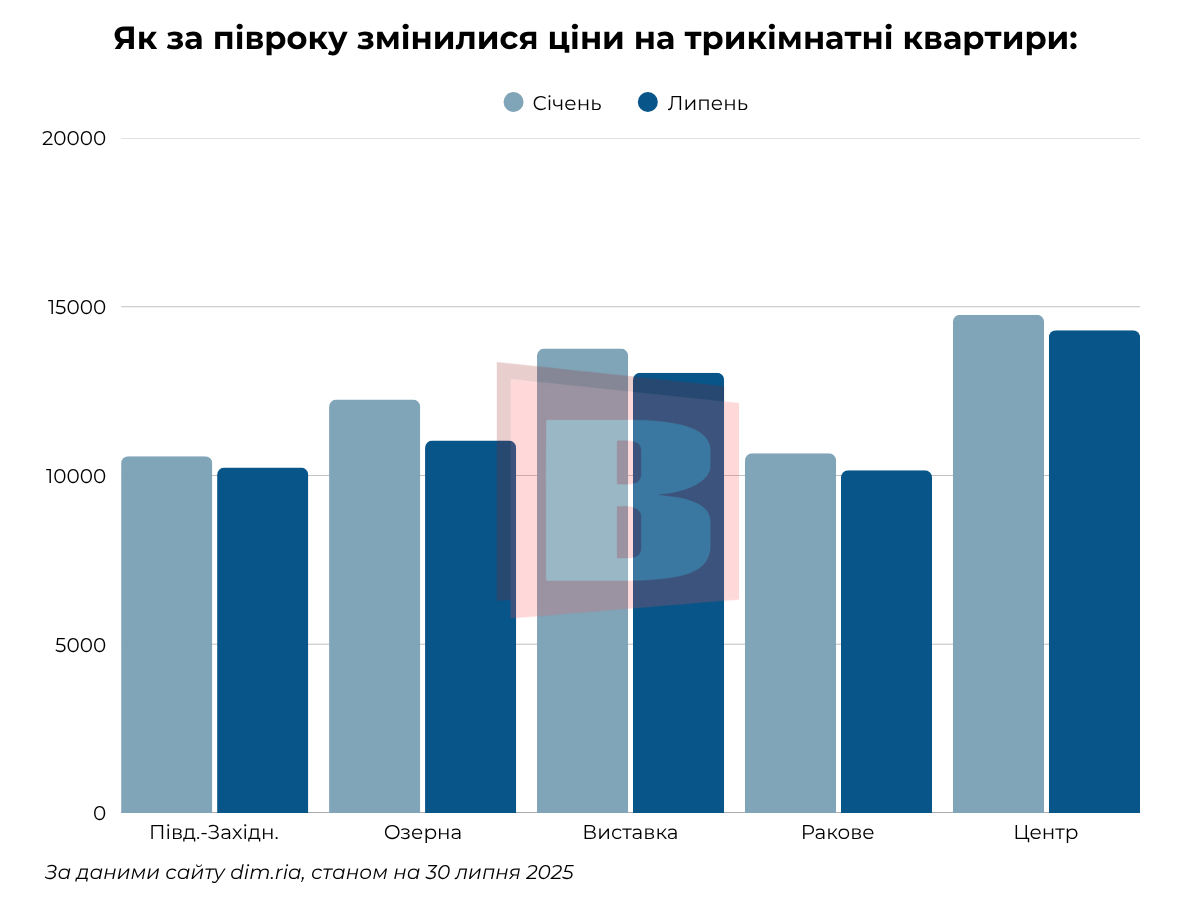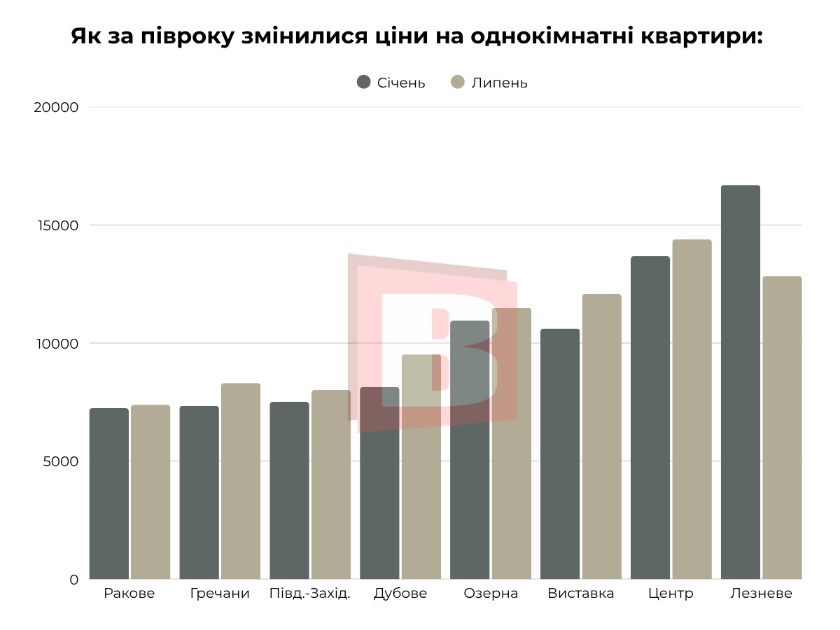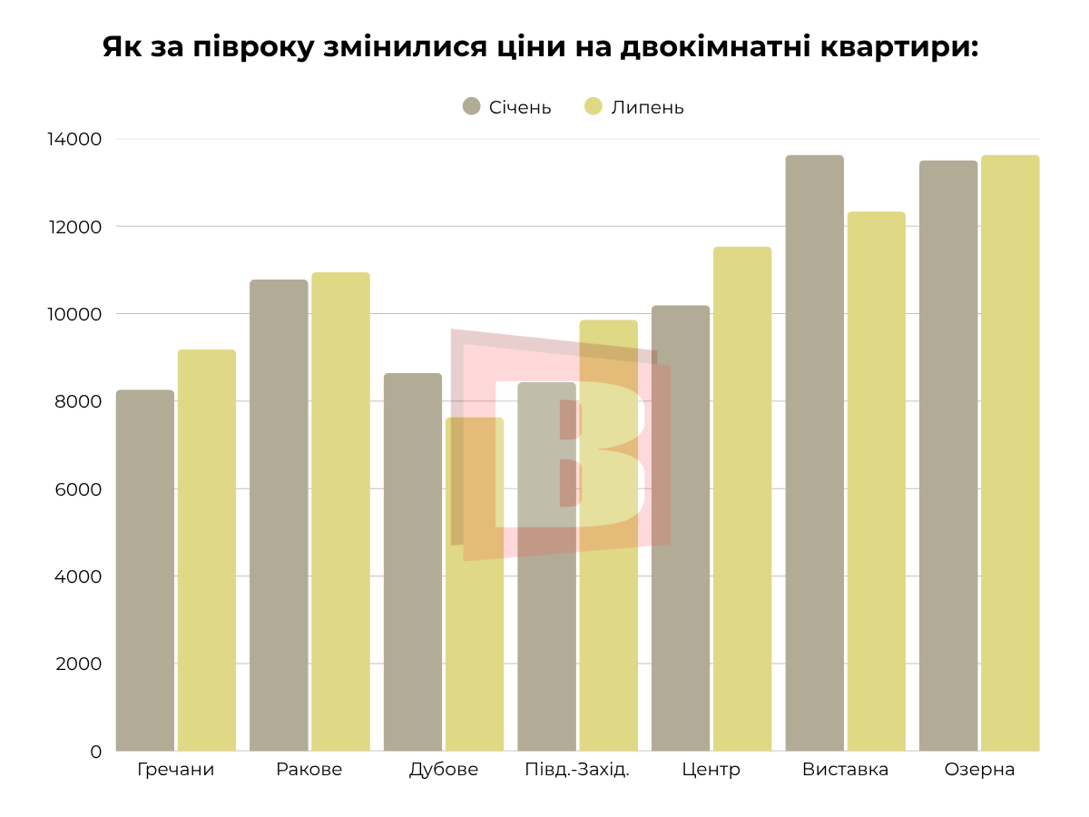 Щодо двокімнатних квартир, то найдорожчі на Озерній. Там середня ціна – 13 508 гривень. Дешевше в Дубовому, 7 509 гривень.
