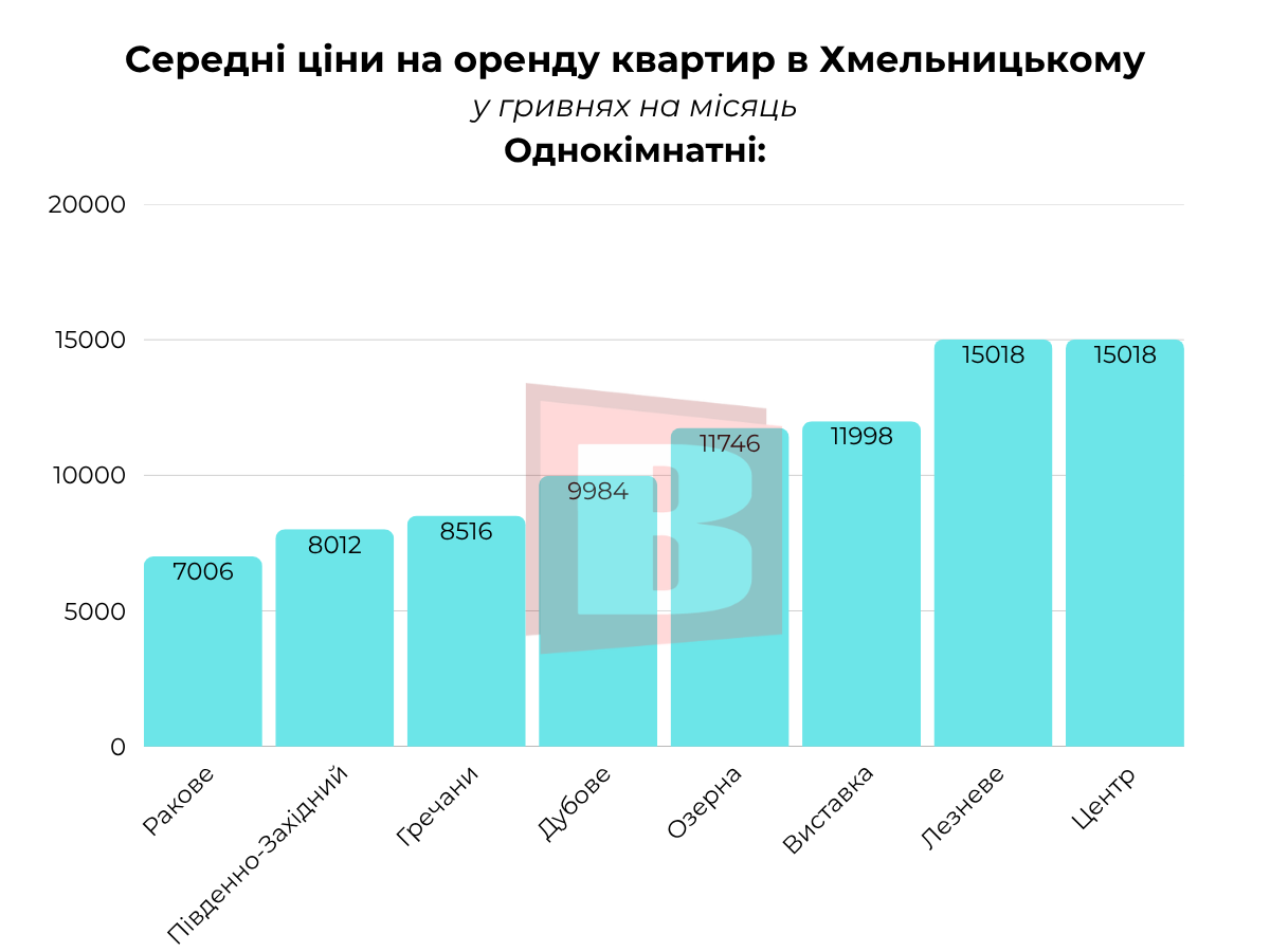 За півроку підвищилася вартість оренди і в Хмельницькому. Наразі середня ціна, за даними dim.ria, складає 13 424 гривні. Однокімнатну квартиру найдорожче винаймати в центрі чи в мікрорайоні Лезневе. Середня вартість – 15 018 гривень. Найдешевші варіанти з-поміж однокімнатних у Раковому – 7 006 гривень.