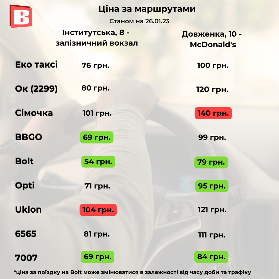 Зауважимо, що ціни за поїздки на таких службах, як Bolt та Uklon, можуть змінюватися, в залежності від часу доби, попиту замовлень та трафіку.