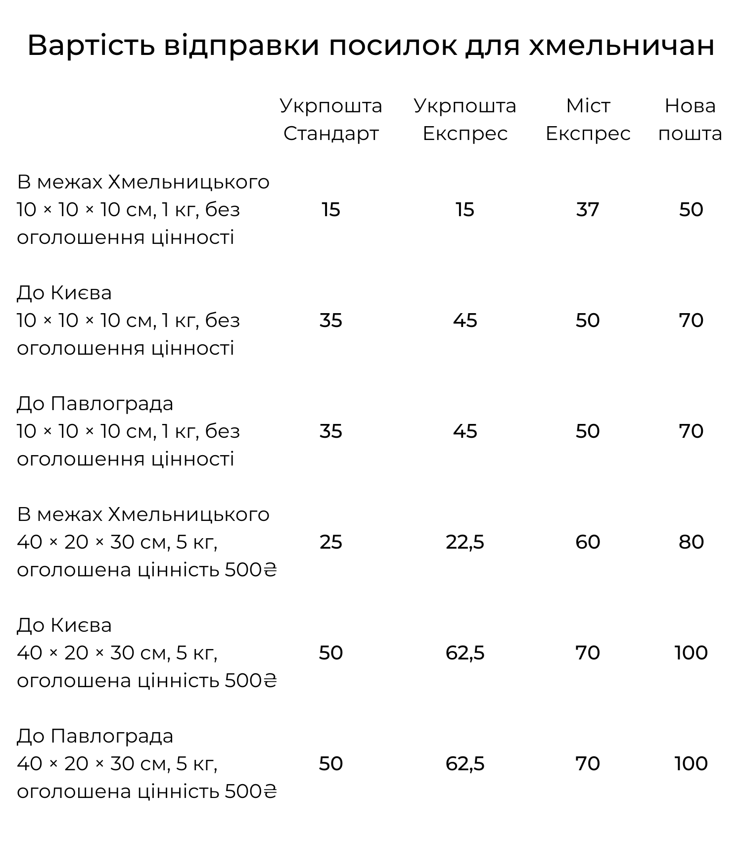 З отриманих даних зрозуміло, що найдешевше відправляти посилки «Укрпоштою» за тарифом «Стандарт». Кілограмовий пакунок в межах Хмельницького доставлять лише за 15 гривень, а по Україні — за 50 гривень.