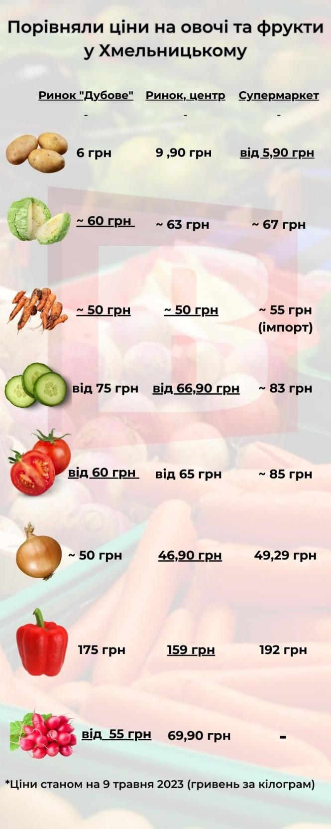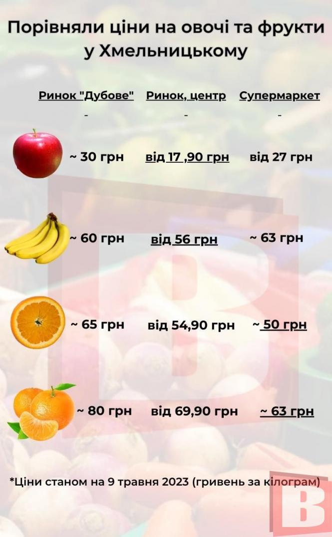 Цього разу ми підготували перелік овочів та фруктів, які хмельничани купують найчастіше. Для цього відвідали два продовольчих ринки, а також супермаркет. Пропонуємо переглянути ціни в інфографіці. Найнижчу ціну на товар ми підкреслили лінією.