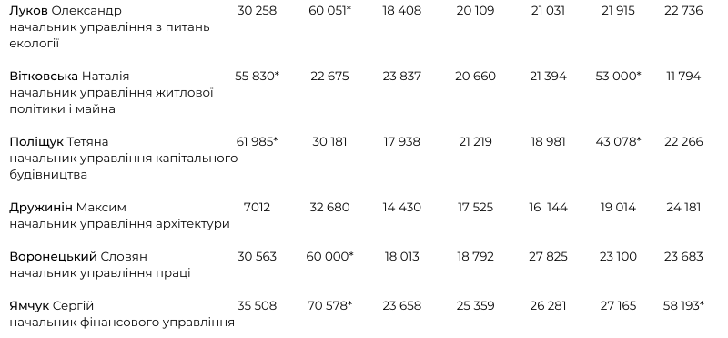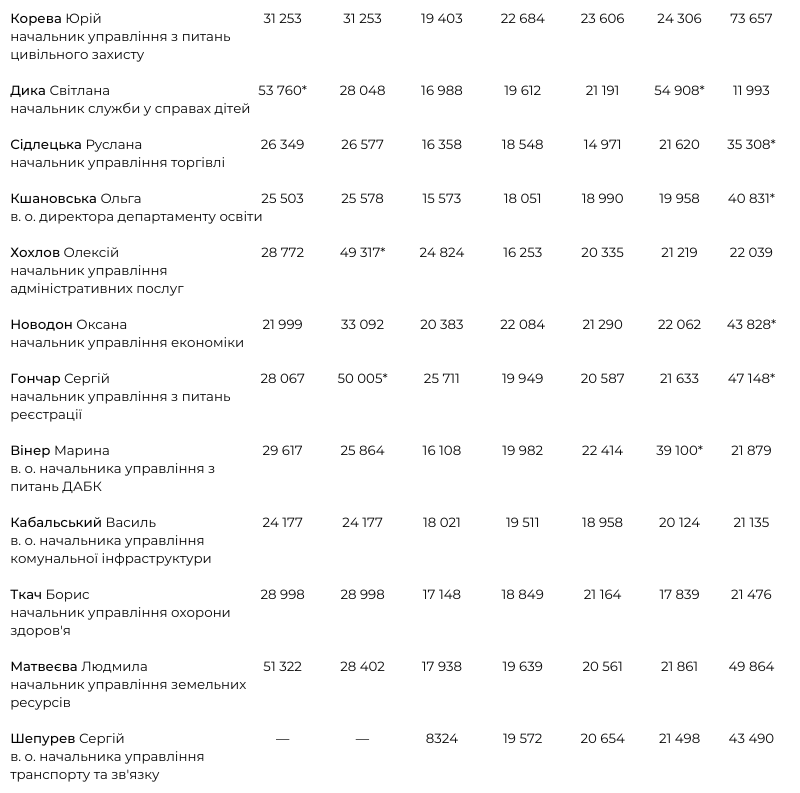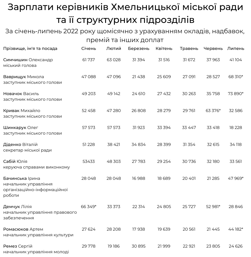 зірочками позначені суми, які включають матеріальну допомогу на оздоровлення або вирішення соціально-побутових питань