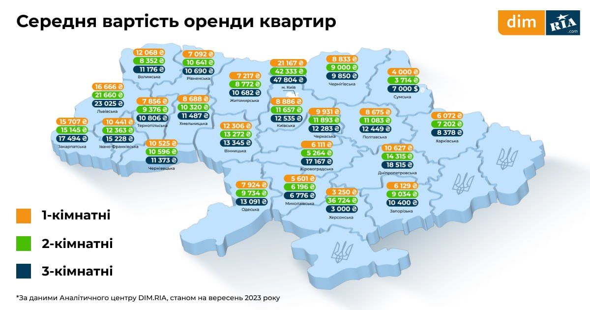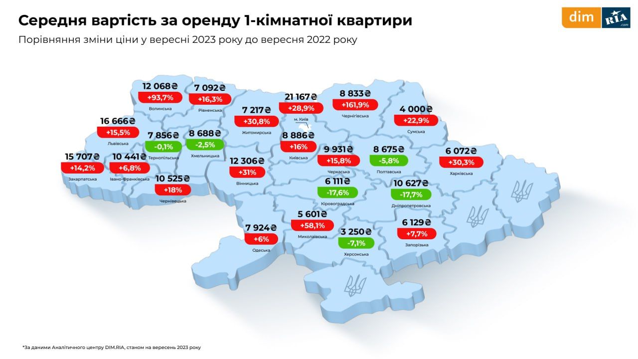 Оренда квартир. Однокімнатні квартири на Хмельниччині зараз здають у середньому за 8688 гривень, двокімнатні — 10 320 гривень, трикімнатні — 11 487 гривень. За рік зміни були незначними: -2,5% для однокімнатних, +5% для двокімнатних та -3,2% для трикімнатних квартир. Більше даних можна переглянути на картах нижче.