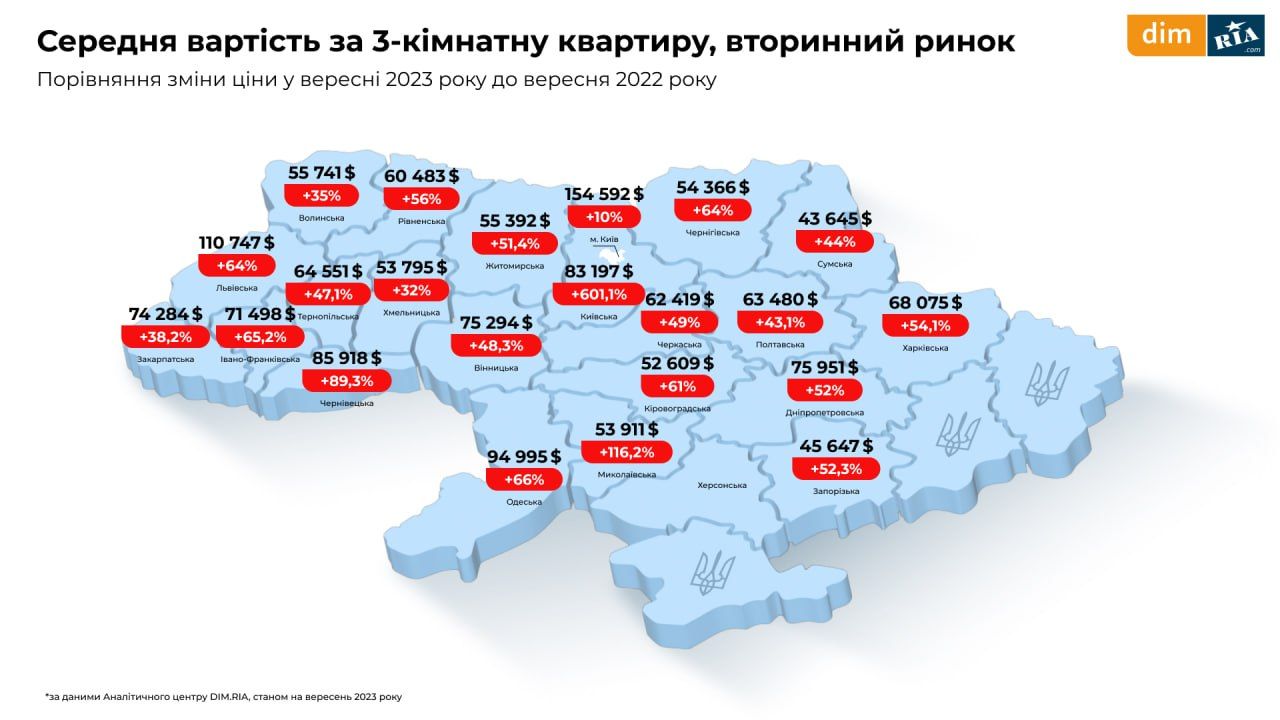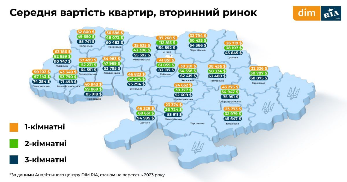 Купівля квартир. Квадратний метр житла у новобудові нині коштує в середньому 24 241 гривню. За рік цей показник зріс на 17,6%. Зростання «квадрата» було й у інших регіонах України, за виключенням Харківщини та Миколаївщини. Рекорд продемонструвала сусідня Тернопільська область, де за рік «квадрат» здорожчав більш як на половину. На вторинному ринку однокімнатні квартири коштують у середньому 34 983 долари, тобто майже 1,3 мільйона гривень.