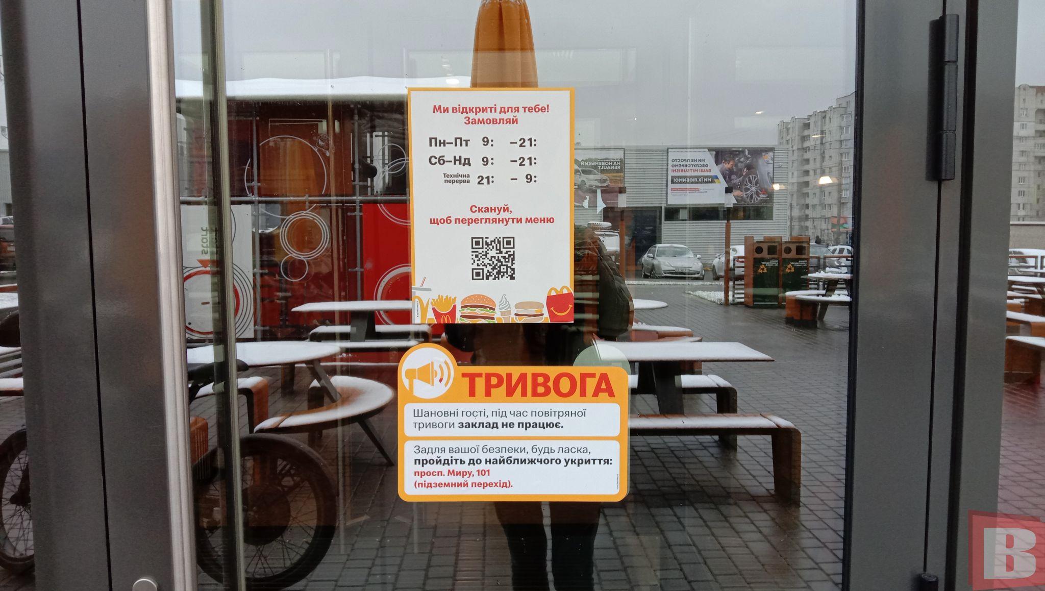 Загалом у роботі «McDonald’s» можна помітити кілька змін. Перша — відсутність будь-якого контролю за дотримання карантинних норм. Друга — інший графік роботи. Раніше заклад працював цілодобово, тепер же тільки від 9 до 21 години. Третя зміна — ресторан не працює під час повітряних тривог, про що сповіщає оголошення на вході. Раніше у компанії повідомили журналістам vsim.ua, що заклад не прийматиме клієнтів також у випадку відсутності світла.