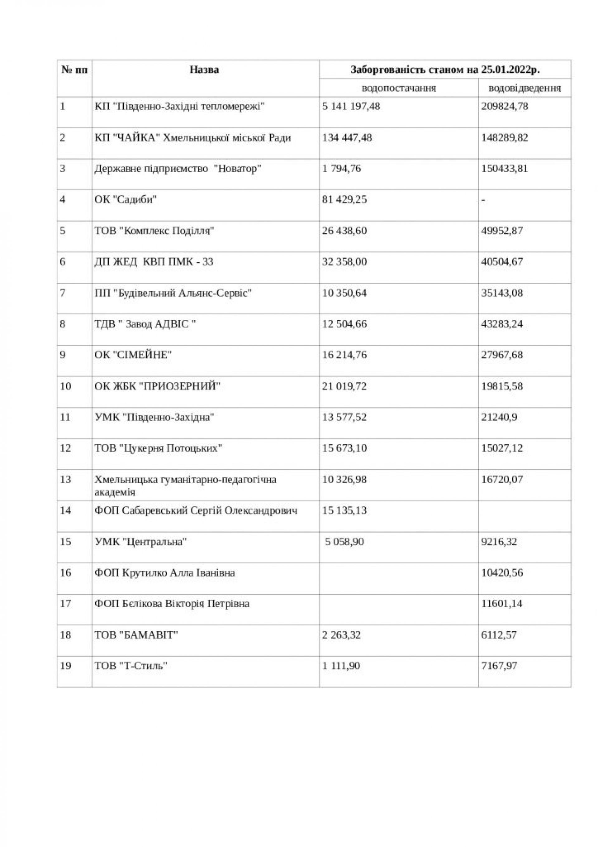 Традиційний антирейтинг оприлюднили у “Хмельницькводоканалі”. У списку - комунальні підприємства, “Новатор”, житлові комплекси, ТОВ і гуманітарно-педагогічна академія. Про це йдеться на сайті міського комунального підприємства. Загалом в антирейтингу є 19 боржників. Інформація комунального підприємства актуальна станом на 25 січня.